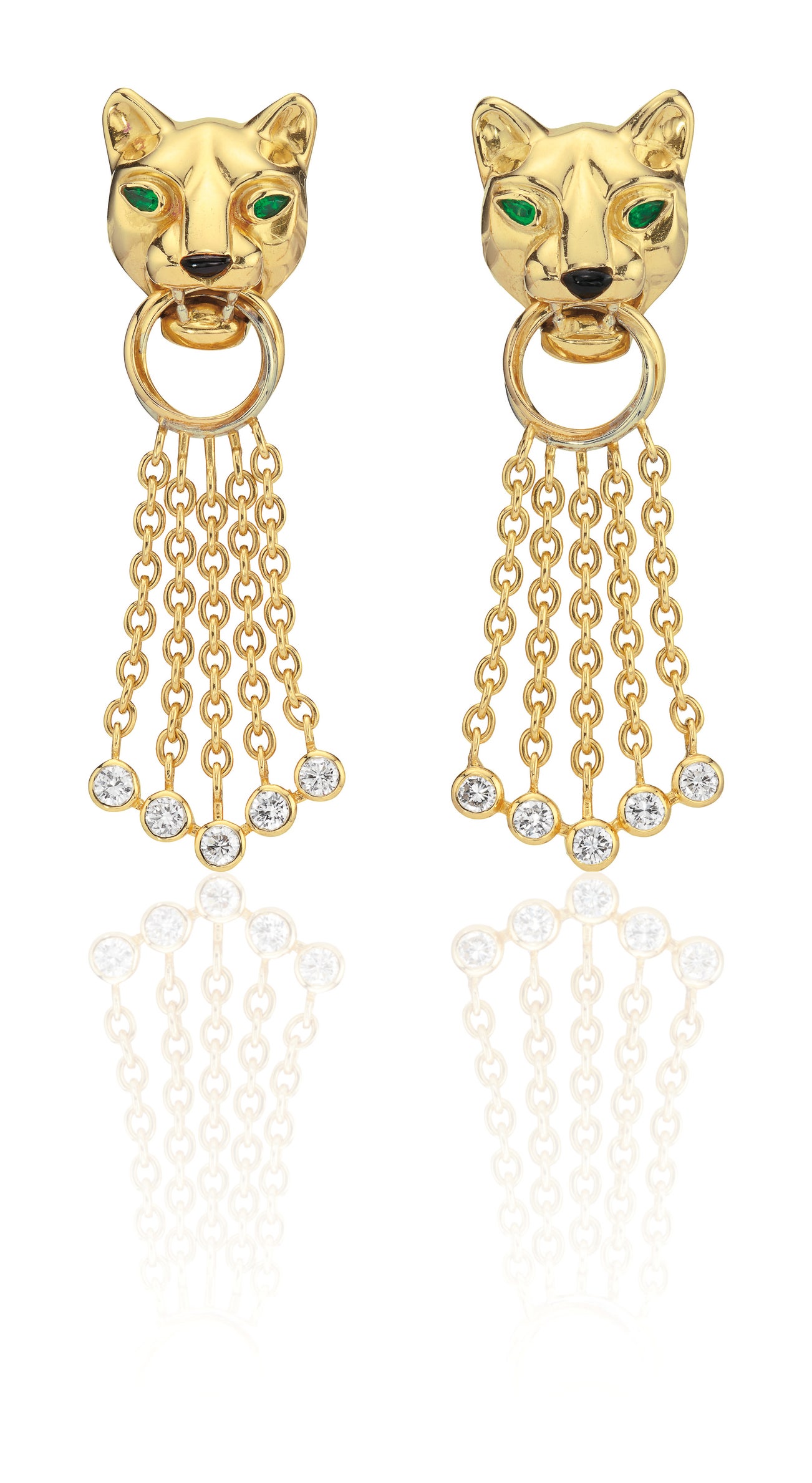 A Pair of Diamond, Emerald, Onyx and Gold 'Panthere' Earrings