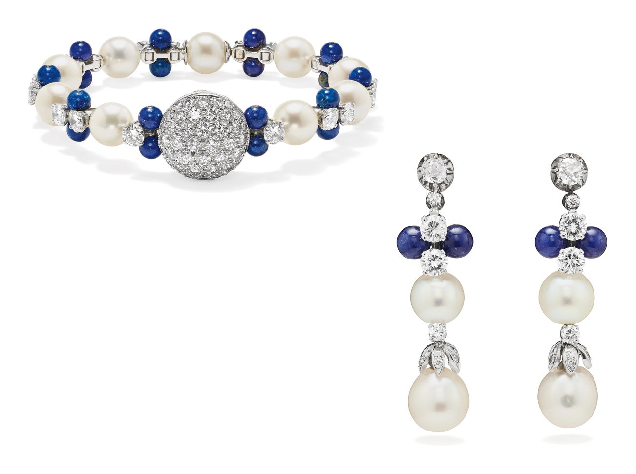Round brilliant-cut diamonds, cultured pearls and lapis lazuli