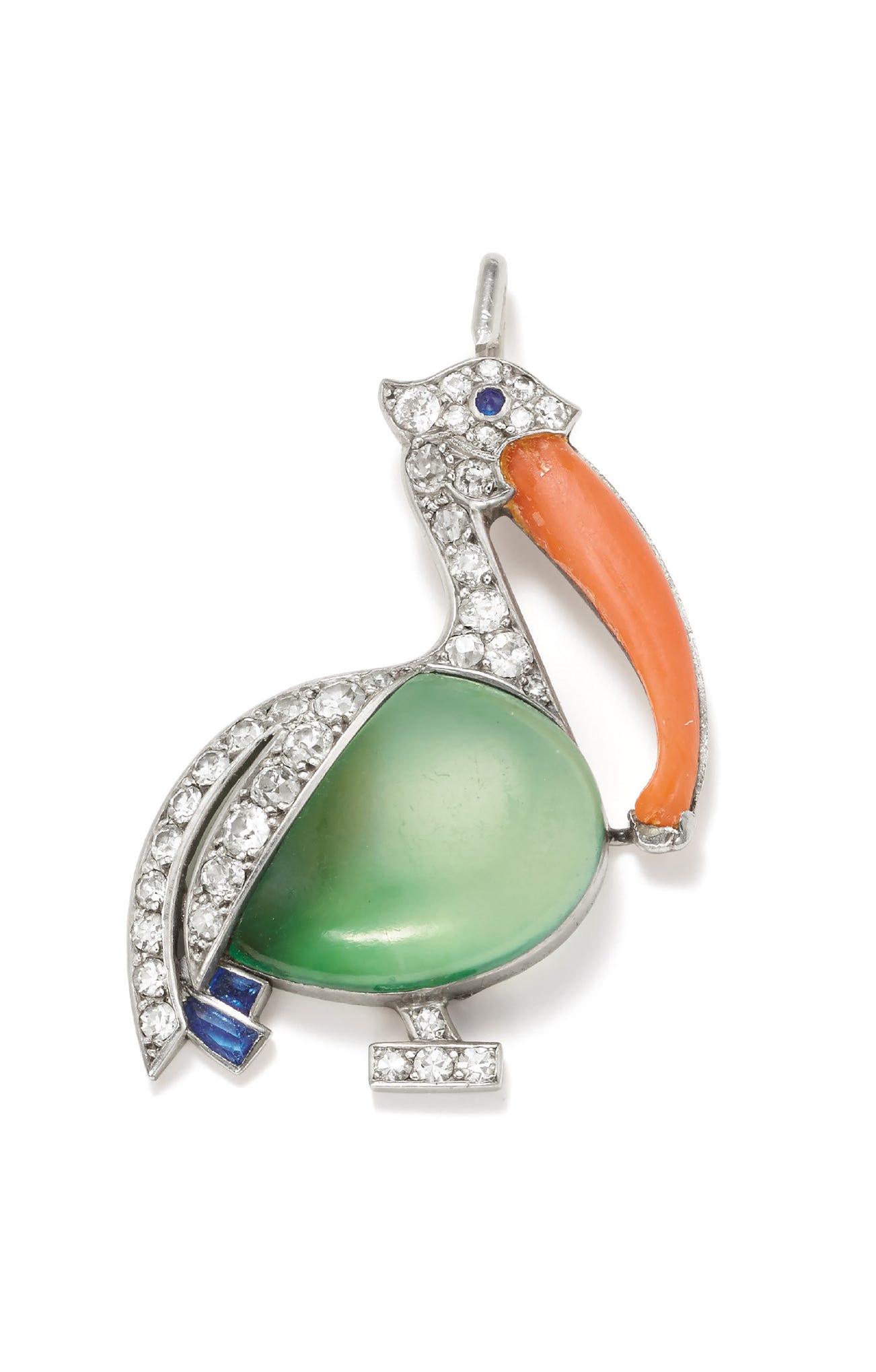 An Art Deco Diamond, Jade, Coral, Sapphire and Platinum Pendant