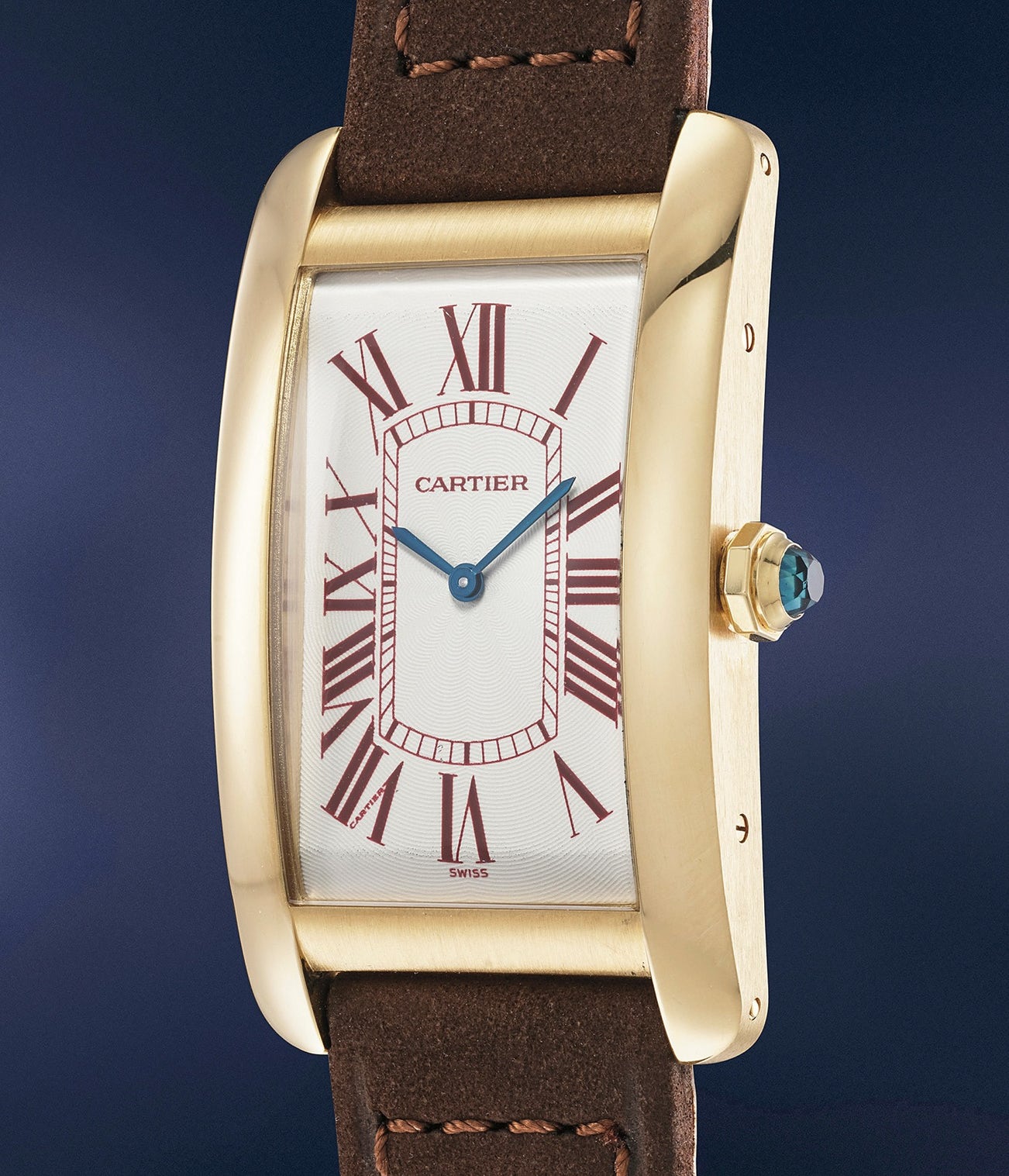 Presented in excellent condition, this Tank Américaine is cased in yellow gold and displays burgundy numerals. Incredibly eye catching, elegant and striking, it was made for the Italian market in 170 examples only. To date, only a handful of examples have come back on the auction market, underscoring its rarity.
