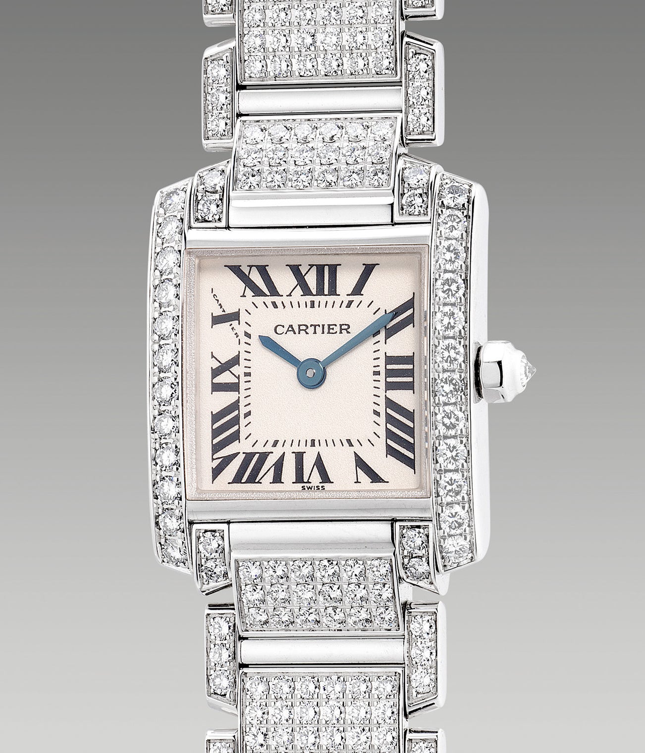 Still a flagship model today, the Tank Française was initially released in 1996 under the leadership of the Richemont group. The present example is certainly a bedazzling one, fully pavé diamond-set on the case and bracelet with approximately 8 carats in total, making it an extravagant lady’s wristwatch.
