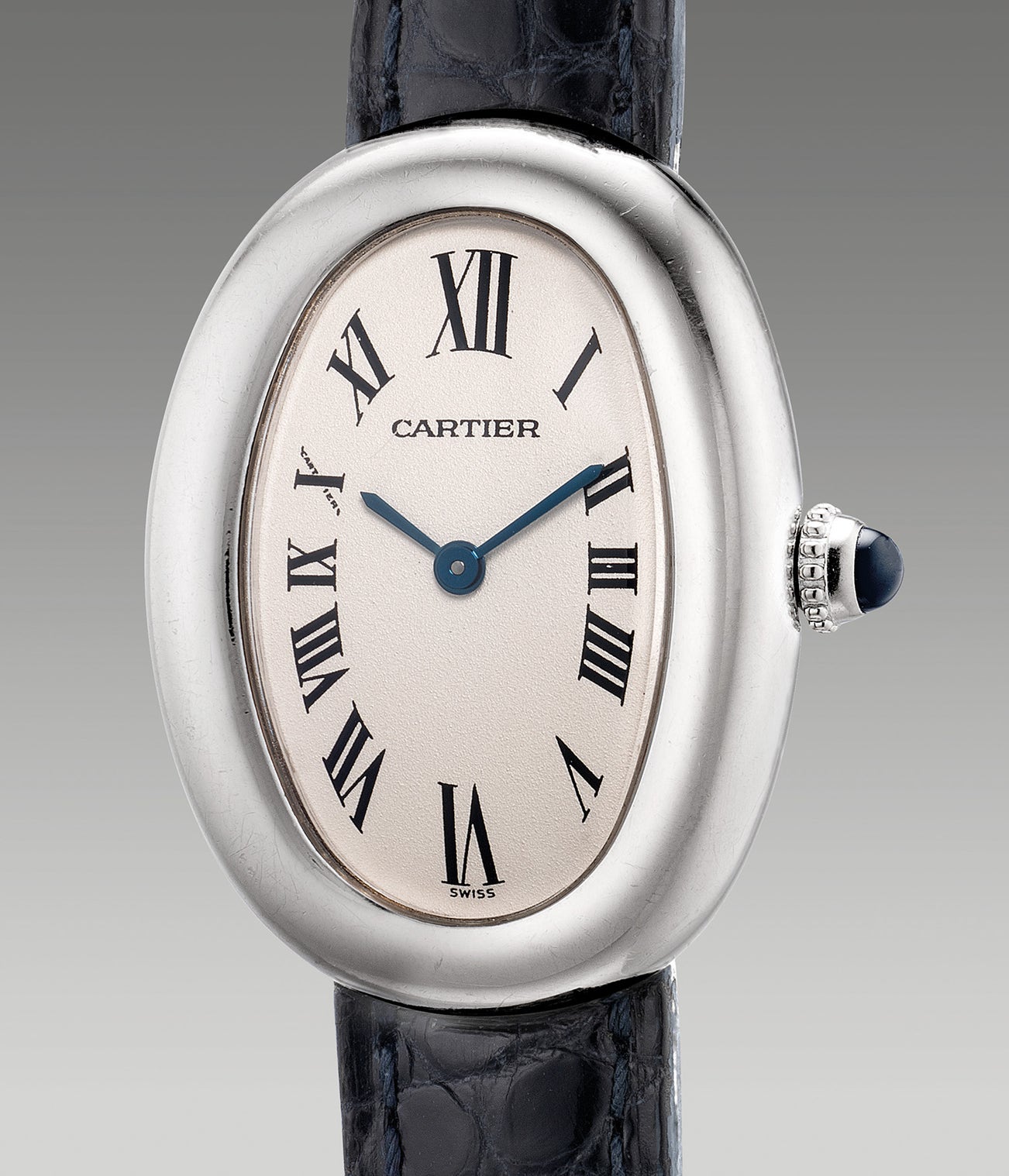 The present Cartier Baignoire from circa 2000 is a modern iteration of the iconic model that still thrives today. Encased in its elegant and timeless white gold oval-shaped case lies a clean white dial with Cartier’s signature Roman numerals paired harmoniously with blued hands.