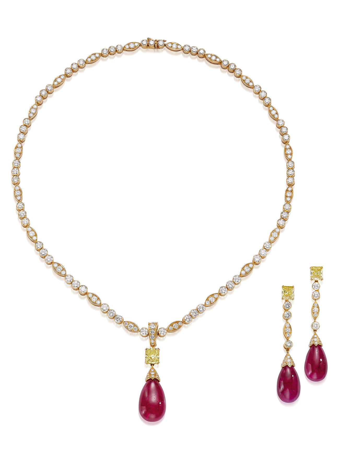 A Ruby, Coloured Diamond and Diamond Necklace and Earrings, Circa 1980