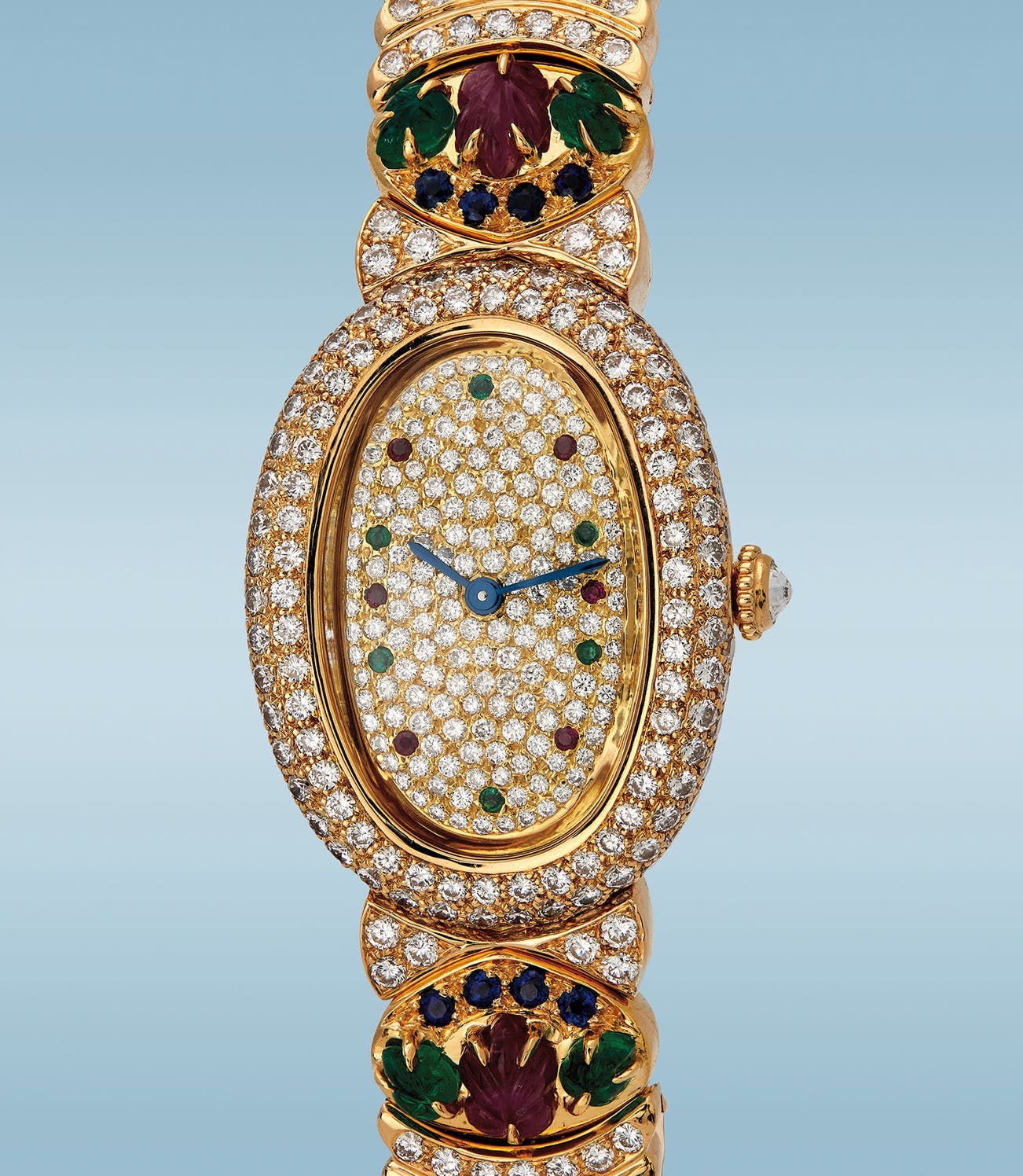 An extravagant and dazzling yellow gold and gem-set bracelet watch with pavé diamond dial, carved emeralds and rubies, and sapphires