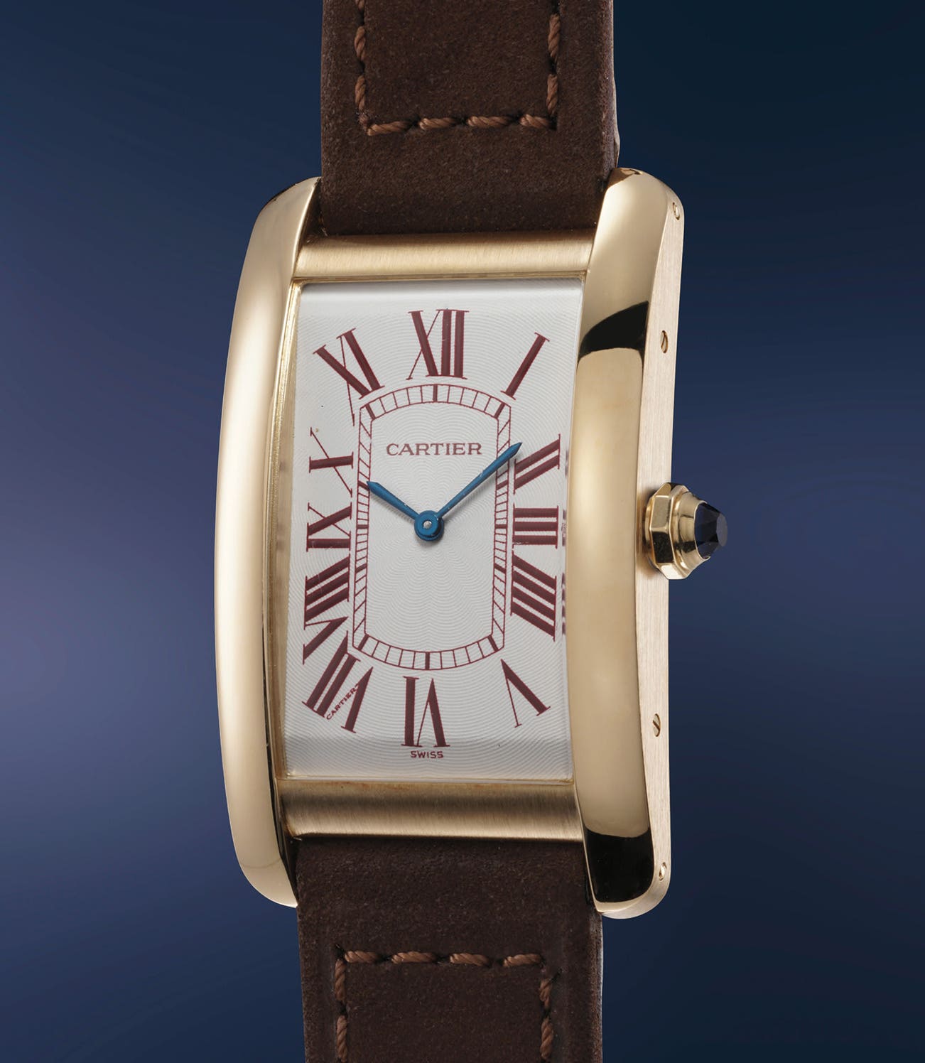 Presented in excellent condition, this Tank Américaine is cased in yellow gold and displays burgundy numerals. Incredibly eye catching, elegant and striking, it was made for the Italian market in 170 examples only. To date, only a handful of examples have come back on the auction market, underscoring its rarity.