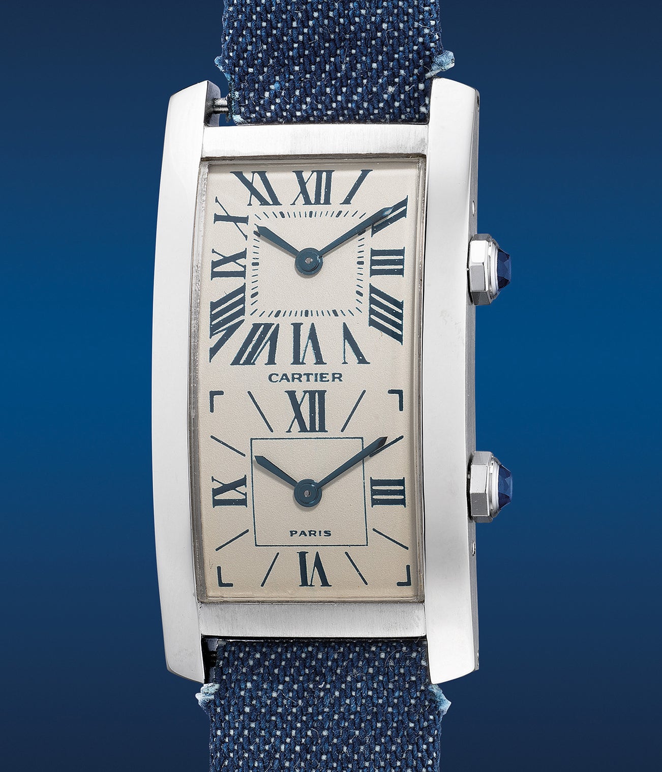 Presented in stunning condition, the present Tank Cintrée Dual-Time is cased in platinum and displays gorgeous indigo numerals against its ivory hued dial with vintage appeal. Sitting with two dials stacked vertically, the top dial features the classic design of Cartier’s Roman numerals for all 12 hour markers, and in contrast the second time-zone is easily differentiated at the bottom by the clean display of 12, 3, 6, and 9 only. Incredibly handsome and sophisticated with subtlety, the caseback reveals its engraving “No.1/1 2004”, underscoring its supreme rarity of being the only one ever made in this configuration. A true collector’s gem, this is a chance not to miss for the discerned collector of Cartier.