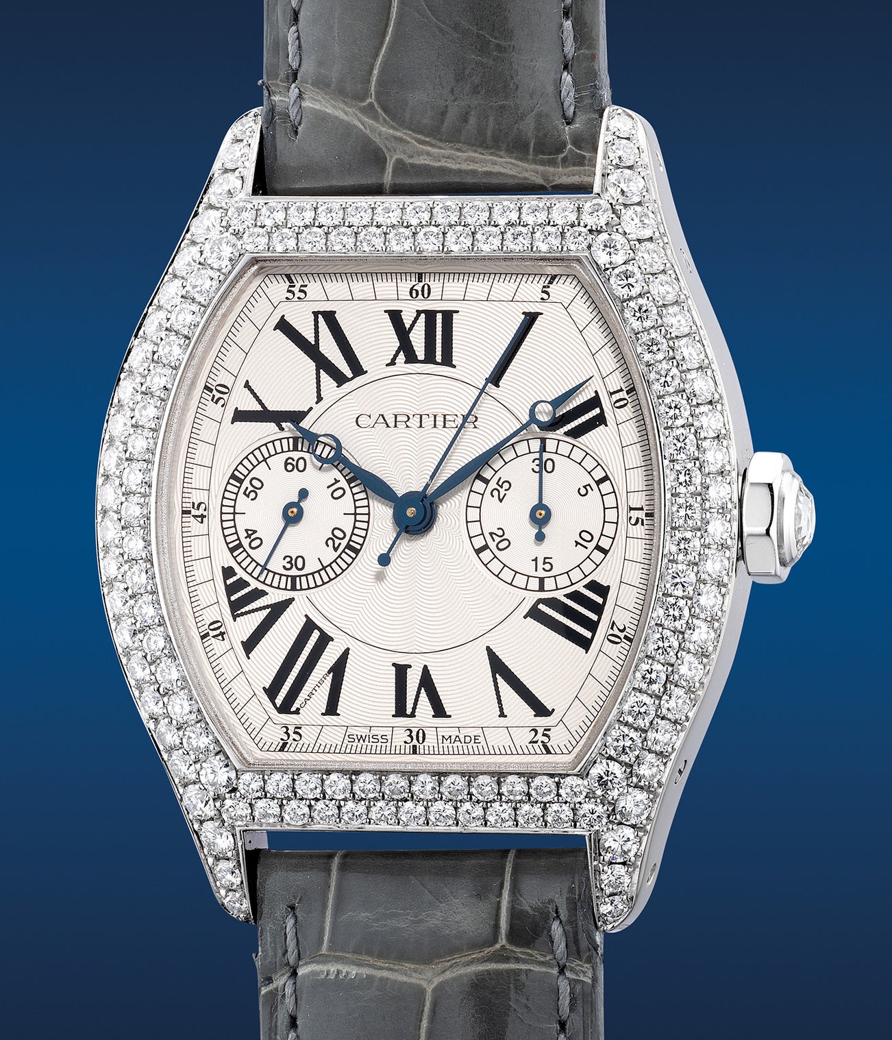 A fine and attractive white gold and diamond-set tonneau-shaped single-button chronograph wristwatch