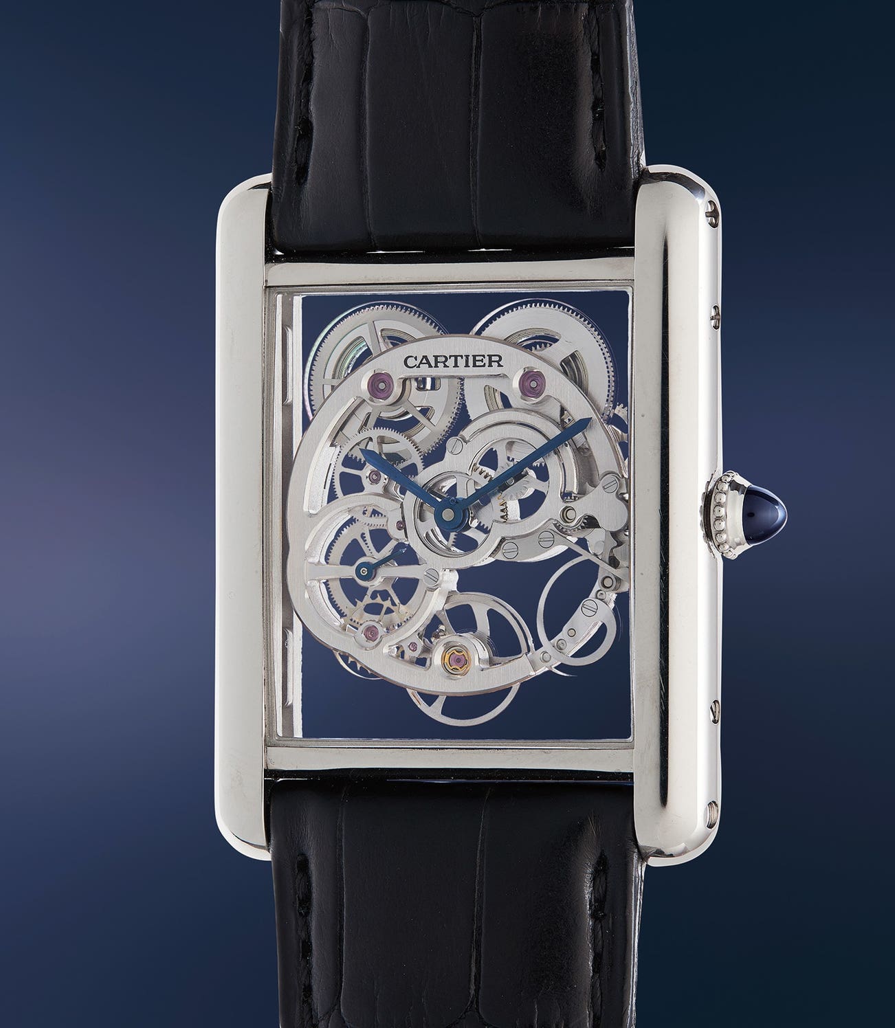 The Tank Louis Cartier Sapphire Skeleton is without a doubt one of these darlings. Introduced at SIHH in 2014, it was first offered only in white gold (the present lot) before being introduced in pink gold the following year. The movement itself, the skeletonized in-house caliber 9616 MC, is suspended between the two sapphire panels making up the front and back of the case. The double barrel movement gives the watch an impressive three-day power reserve, and the sapphire panels are affixed to the case with secret rubber blocks for shock-resistant purposes and to stabilize the movement.