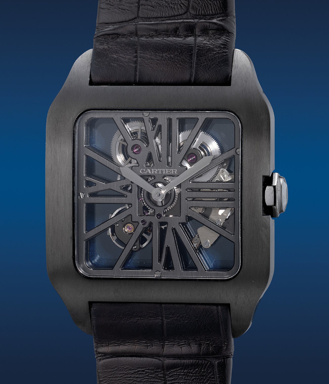 The present contemporary example Cartier Santos Dumont cased in an all-black ADLC-coated titanium case with a fully skeletonized dial with its movement blackened to achieve its all-black appeal is a wonderful interpretation of the famed model. Displaying pure aesthetics, the lightweight titanium case not only provides a comfortable wrist presence but also a cool appeal. Offered in “like new” overall condition and complete with its full set of accessories, the present example from circa 2017 is a perfect choice for daily wear.