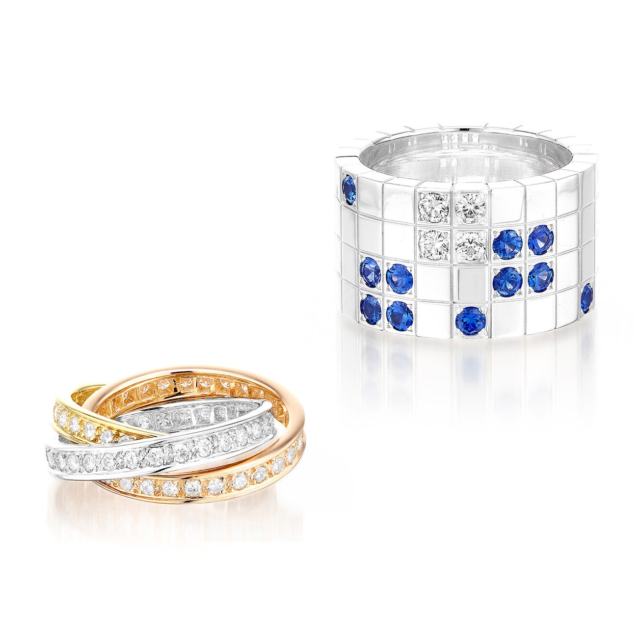 - Interlocking tri-coloured gold bands set with brilliant-cut diamonds, approximately 1.35 carats total