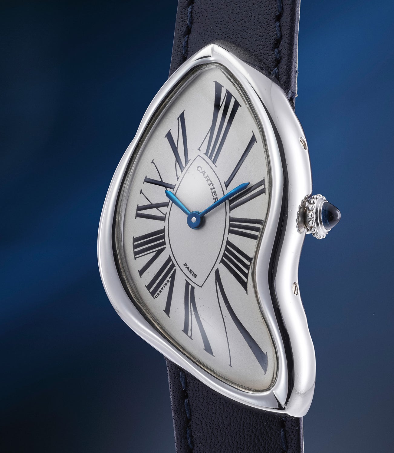 Now well-established in contemporary popular culture, the Crash remains ever more desirable. This Cartier Crash, crafted in noble platinum and dating from the early 1990s, is a restrained and elegant iteration of the earliest versions of the Crash. With a manually-wound movement, the case is entirely hand-made, leading to a very small production run, possibly as low as eight pieces ever created in the 1990s. While Phillips has had the fortune of selling two examples of the platinum Crash in recent memory, the truth is that they appear at auction infrequently, for obvious reasons due to scarcity.