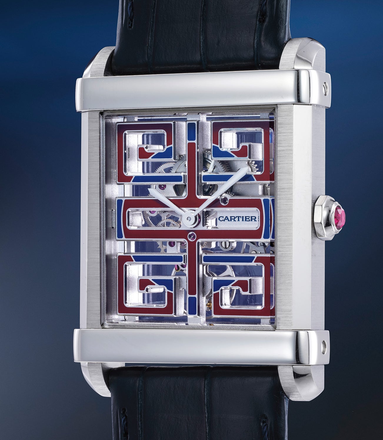 Inside, visible thanks to the rectilinear dial, beats the hand-wind skeleton movement, the 9627 MC. Interestingly, instead of Roman numerals, as one would expect from Cartier’s skeleton movements, the bridges and base plate have been open-worked to form Chinese-inspired geometric pattern. Featuring cobalt blue and burgundy lacquer colours, the geometrical patterns diminish the angularity and edges of the case, giving the watch a pleasant feel on the wrist.