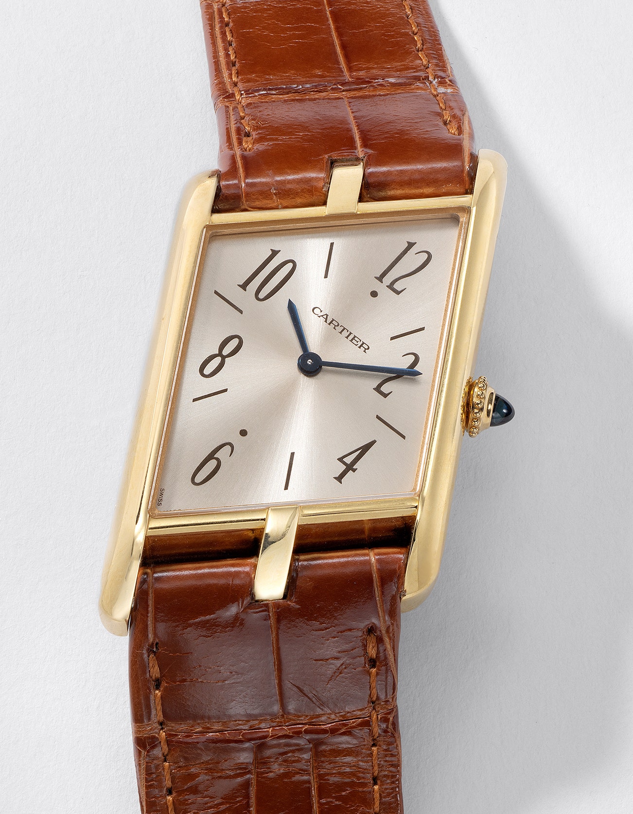 Boasting a luscious yellow gold case, the present Tank Asymétrique is fitted with a striking sunburst champagne dial, topped with chocolate brown Arabic numerals and a signature cabochon sapphire crown. Preserved in stunning condition and accompanied by its original accessories, this exquisite example is certainly a must-have in any collection, especially with the recent soaring craze for fancy-shaped Cartier timepieces.