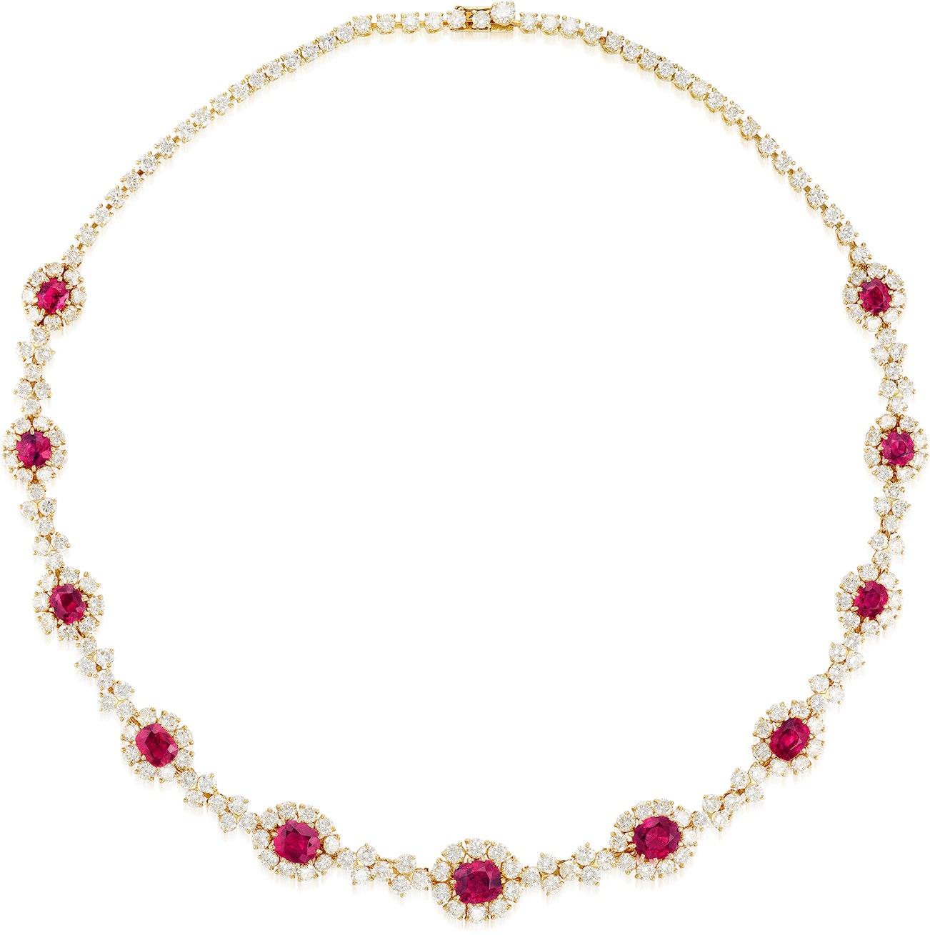 Accompanied by Gübelin report no. 23021253, stating that the rubies are of Burmese origin, with no indications of heating, and that a few of the rubies are called pigeon blood red.