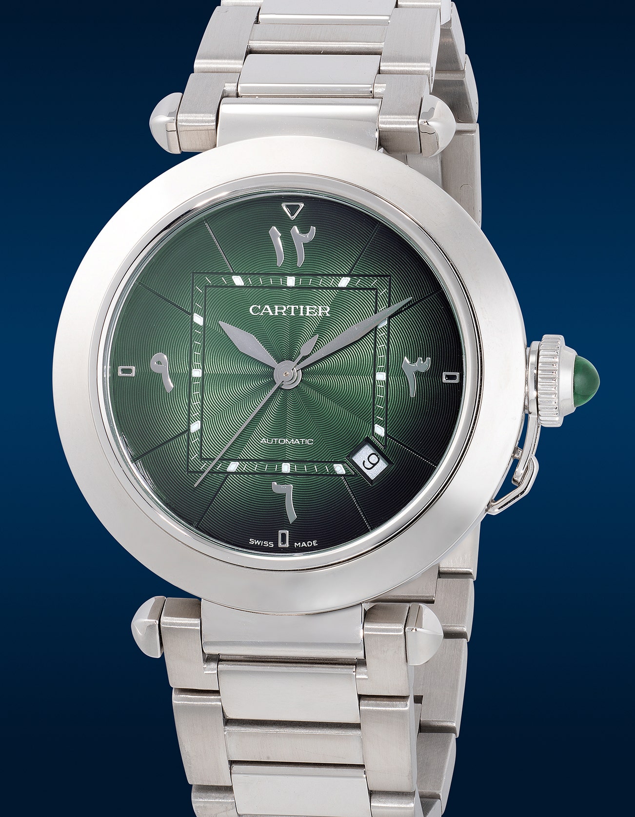 - Today's modern Pasha, reintroduced in 2019, continues the spirit of distinction and exclusivity. The present example is a hard-to-come-by special edition made for the Middle Eastern market featuring a lovely dark green sunray guilloché dial, Eastern Arabic numerals and a green cabochon crown. This Pasha preserved in exceptional condition with its full set of accessories embodies both Cartier's rich heritage and its timeless, sophisticated allure.