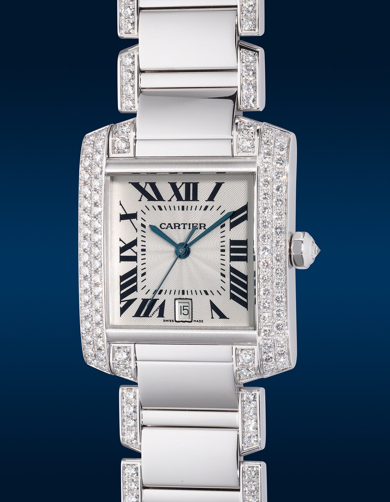 • Preserved in excellent condition, the present Tank Française is certainly a bedazzling one. Fully pavé diamond-set on the case and bracelet, this medium sized timepiece is sporty and sophisticated at the same time. Fitted with a guilloché dial featuring a date function, this Tank Française ticks all the boxes with Cartier DNA: secret signature at 7 o’clock, blued- steel hands, Roman numerals and a diamond cabochon on the crown.