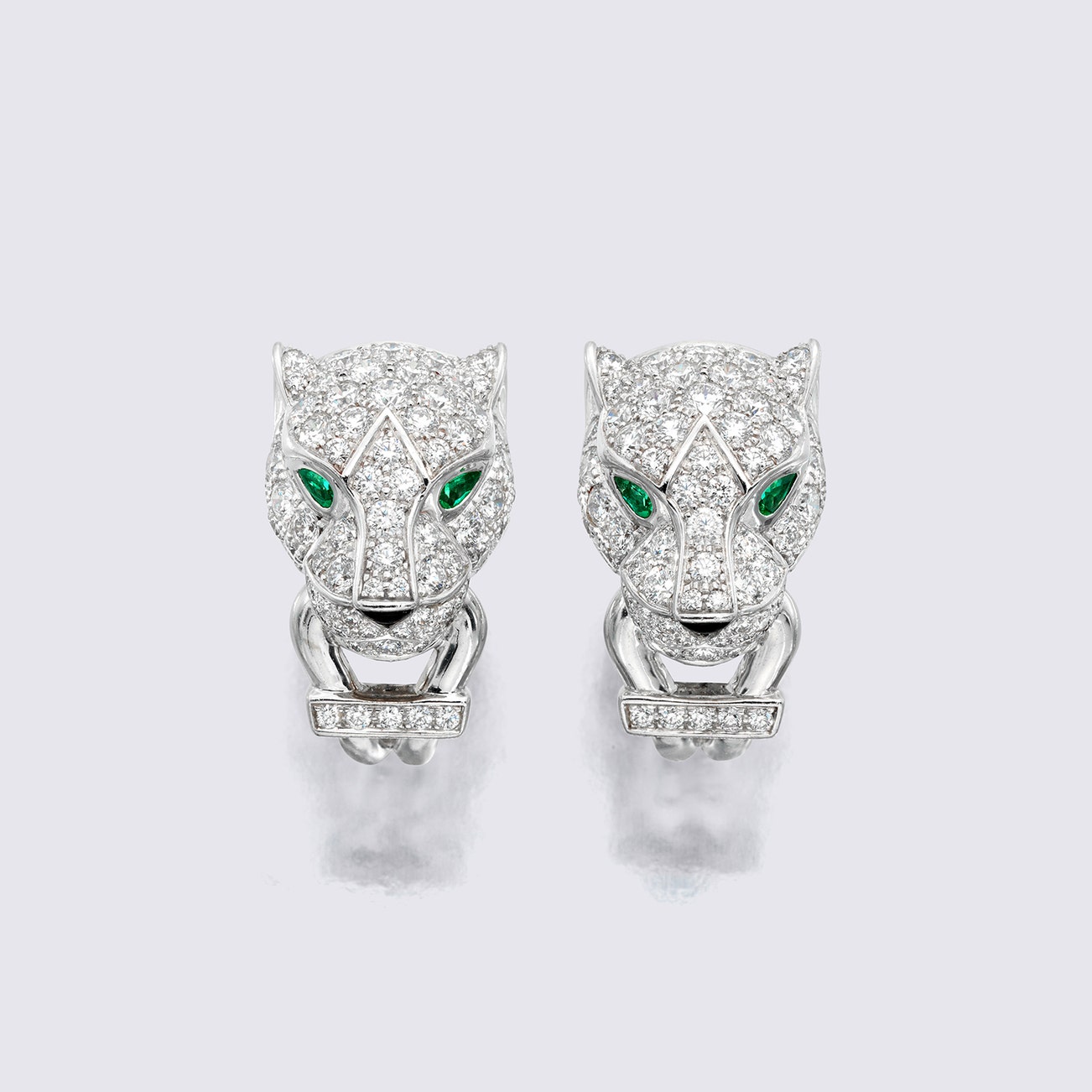 Pair of Diamond, Emerald and Onyx Earrings, 'Panthère'