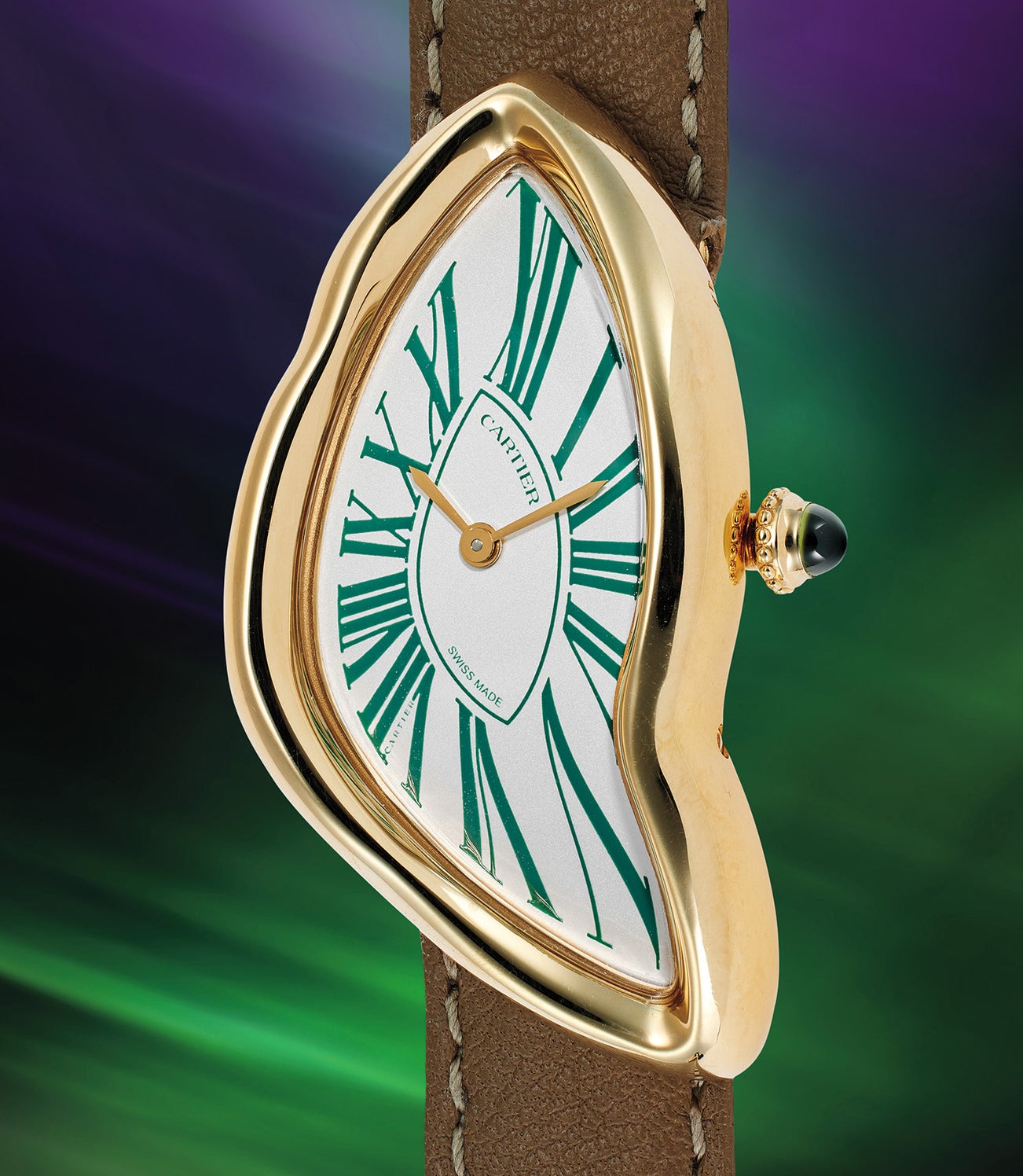 Most certainly the result of a special commission request, the present watch was purchased in December 2023 and remains in brand new, unworn condition. What is especially striking about this watch is the beautifully chosen green roman numerals as well as the yellow gold hands that match the curvaceous case. The olive green sapphire cabochon adds another element of delightful cohesion. While green is perhaps not the most obvious choice when it comes to a brand like Cartier, the end result is stunning.