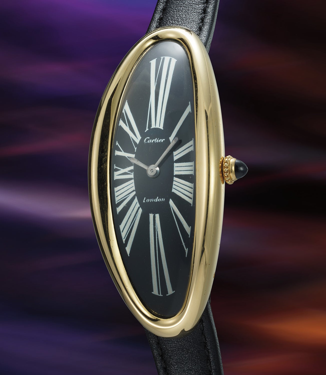 An important, extremely rare and attractive oversized and elongated wristwatch with blue/black dial, retailed by Cartier London