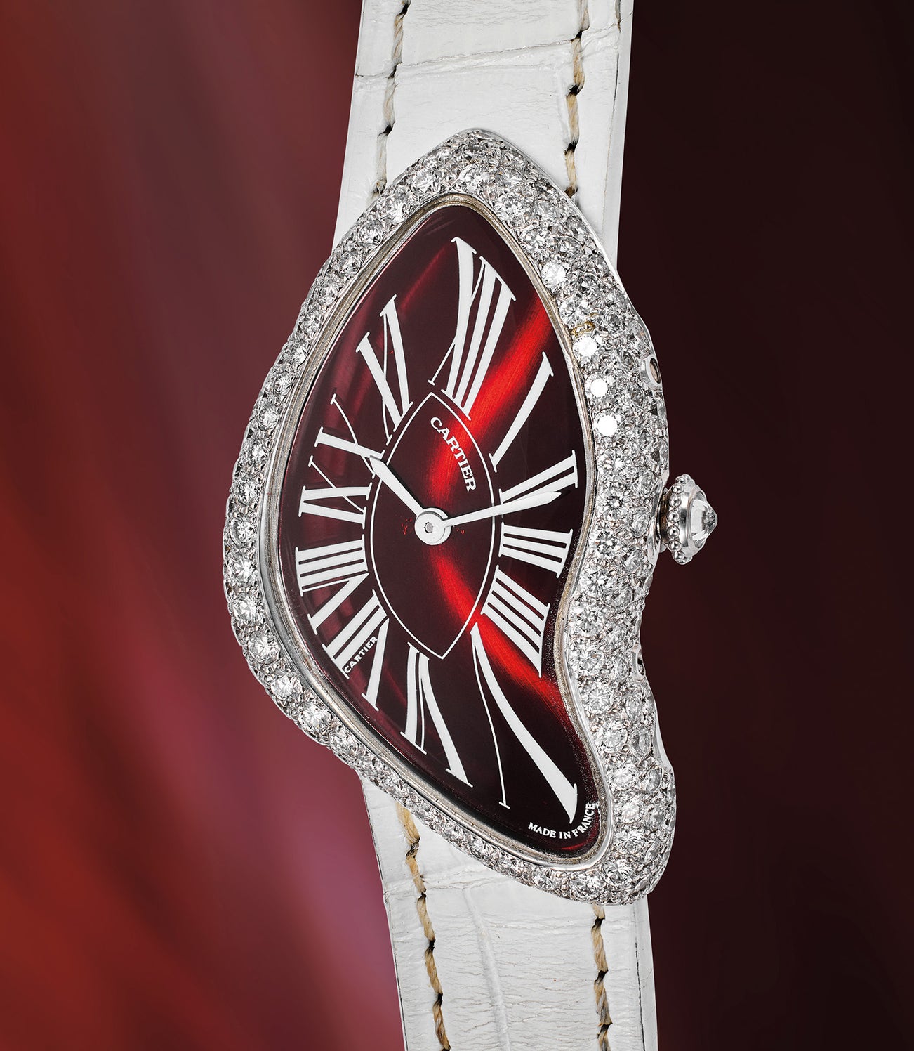 An extremely rare and exceptional white gold and diamond-set asymmetrical wristwatch with additional burgundy red lacquer dial, Certificate of Origin, and presentation box