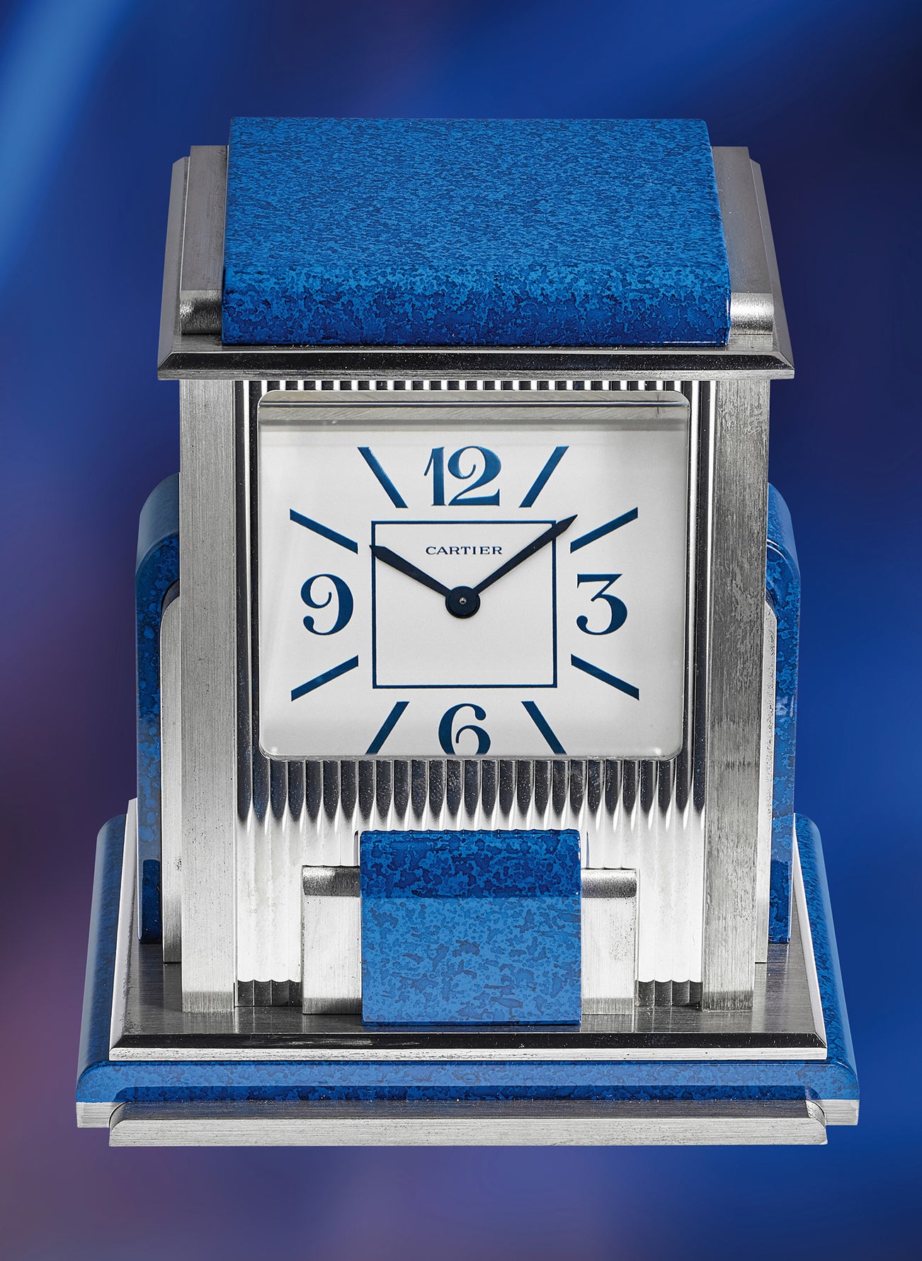 Boasting a silver and blue color scheme that is often associated with neo-vintage Cartier pieces, such as the lapis Tank must de Cartier or the CPCP Monopoussoir Tortue in white gold, the present desk clock has a silver-plated case with decorative lapis lazuli panels, resulting in a harmonious aesthetic. The dial of this prism desk clock also features blue Arabic quarter numerals against a silver dial.