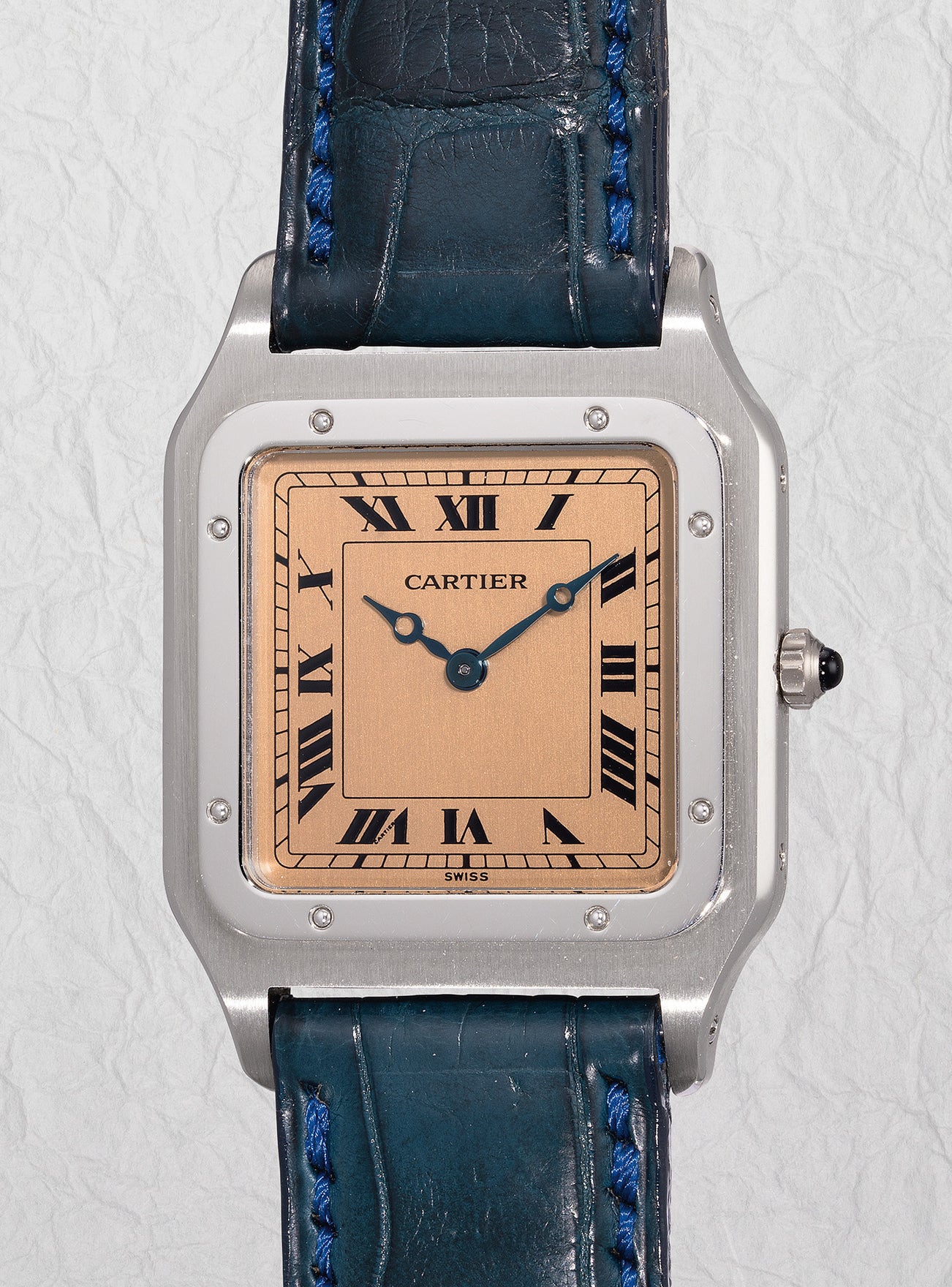 A very well-preserved limited edition platinum wristwatch with ‘salmon’ dial, guarantee and presentation box, numbered 42 of a limited edition of 90 pieces made to commemorate the 90th anniversary of Santos-Dumont