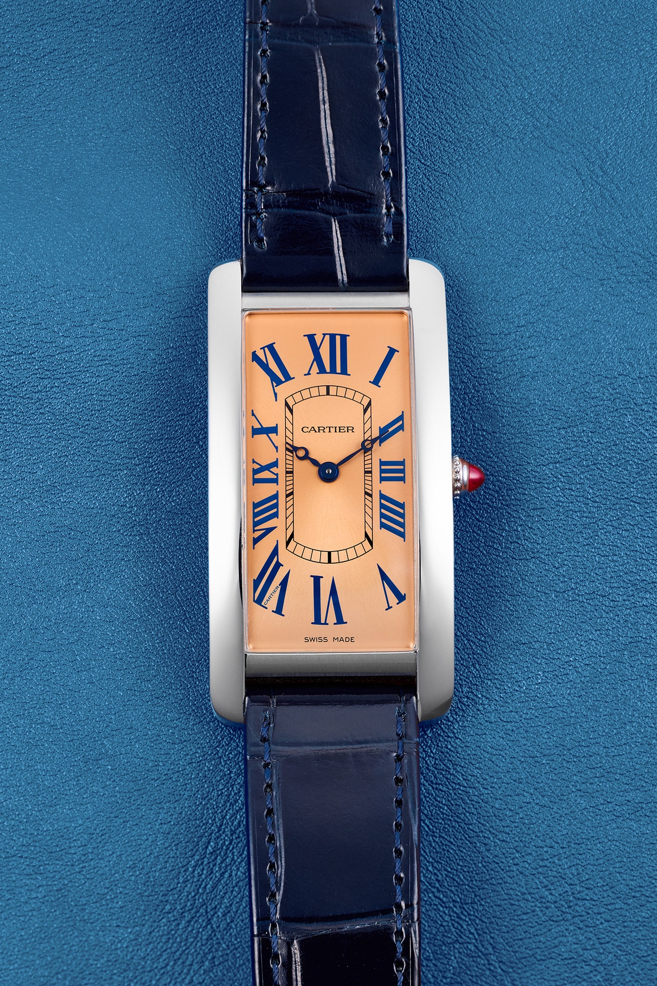 --The present platinum Tank Cintrée, numbered “No. 1”, is a most probably unique example commissioned via Cartier’s NSO, or New Special Order, program by a collector with superb taste. The NSO program required applications to be reviewed before the designs could be granted and produced, and as of March 2025, the program has been suspended. Cartier created this bespoke masterpiece with a stunning salmon dial featuring classic gorgeous Roman numerals in lacquered blue surrounding a black chemin-de fer minute track. The crown is adorned with a ruby cabochon, signifying the use of platinum for the case material.
