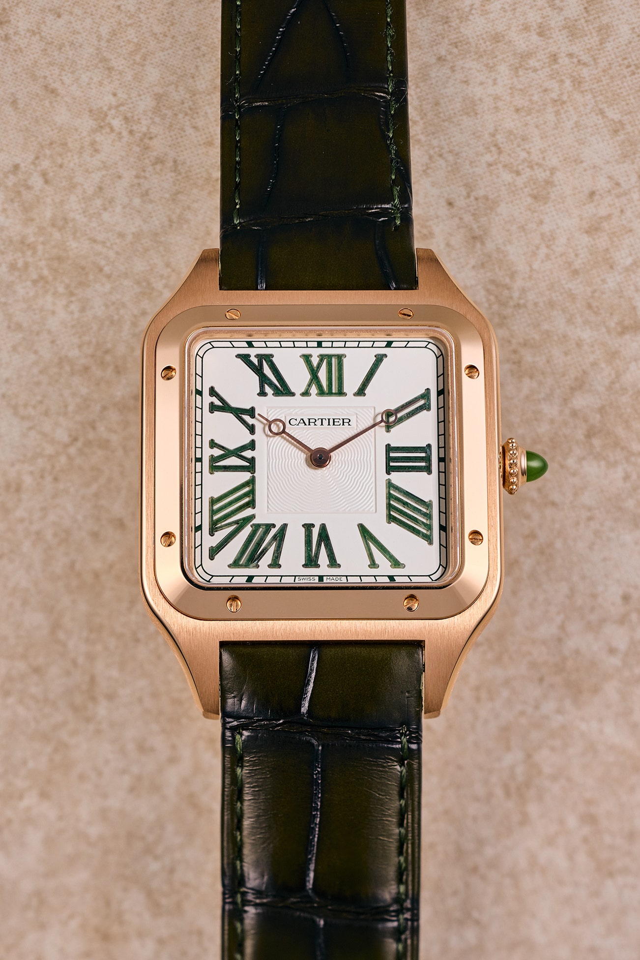 --In 2023, Cartier released the Santos-Dumont XL collection at Watches and Wonders, pairing mineral set hour markers with precious case metals including yellow gold, rose gold and platinum. The brushed cases feature polished bezels and bevels with a substantial (XL) but well-proportioned case size of 46.6mm length x 33.9 width.
