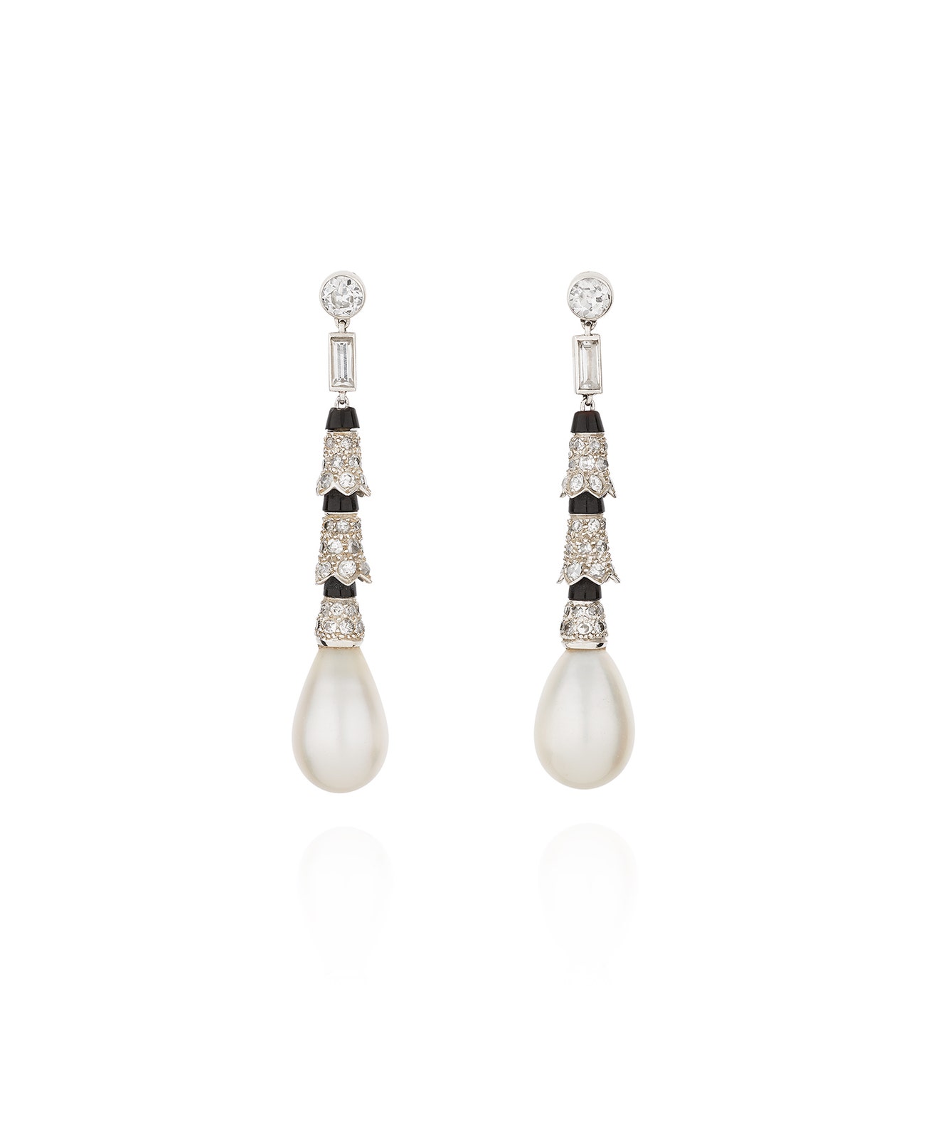 Pair of natural pearl, onyx and diamond earrings, circa 1920