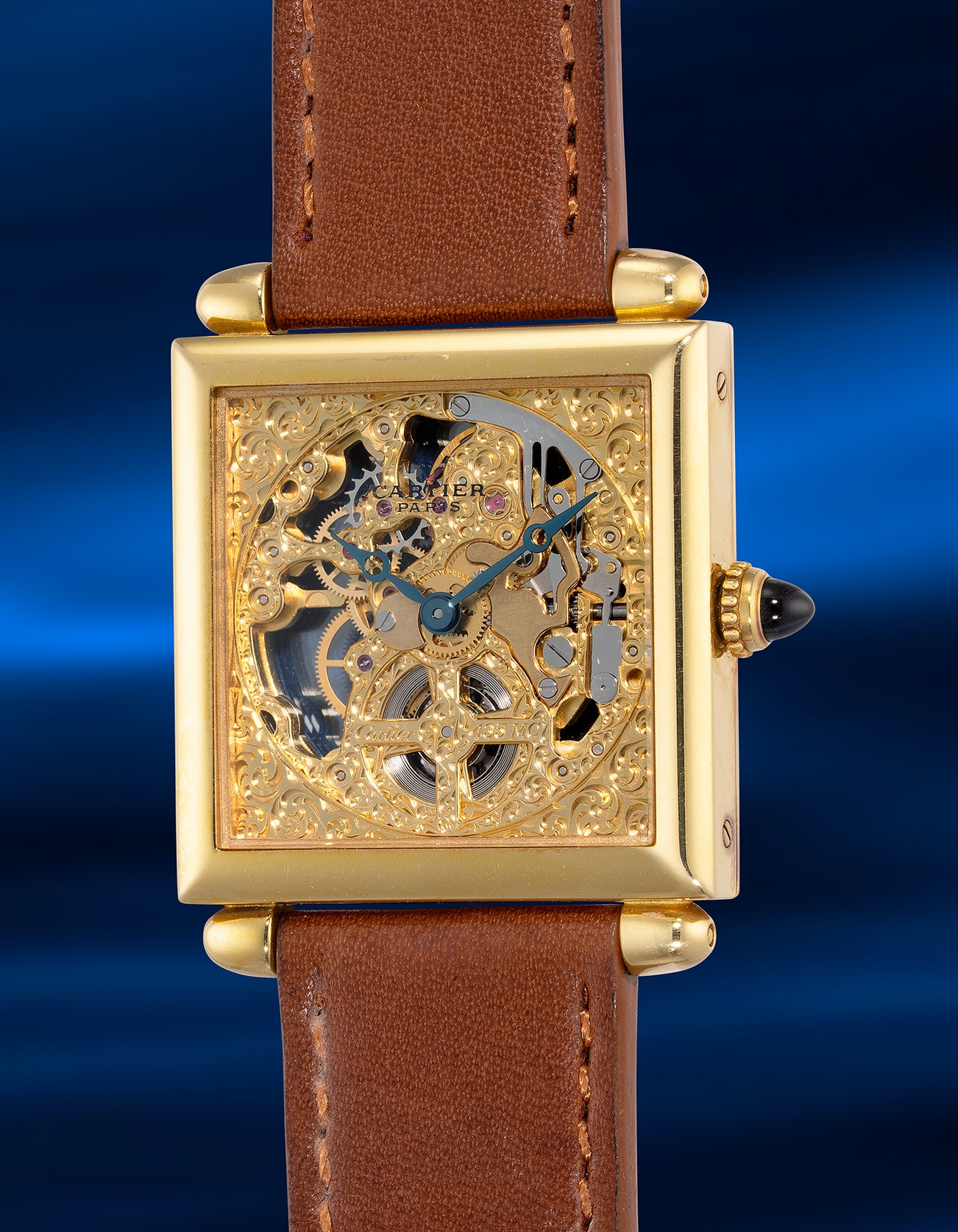 - The exhibition caseback showcases the hand-engraved skeletonized bridges within its manual-wind movement, making this Obus one of the most stylistically unique Cartier models from the past few decades. Its rarity makes it an ideal acquisition for any watch collector, whether a Cartier devotee or a watchmaking enthusiast.