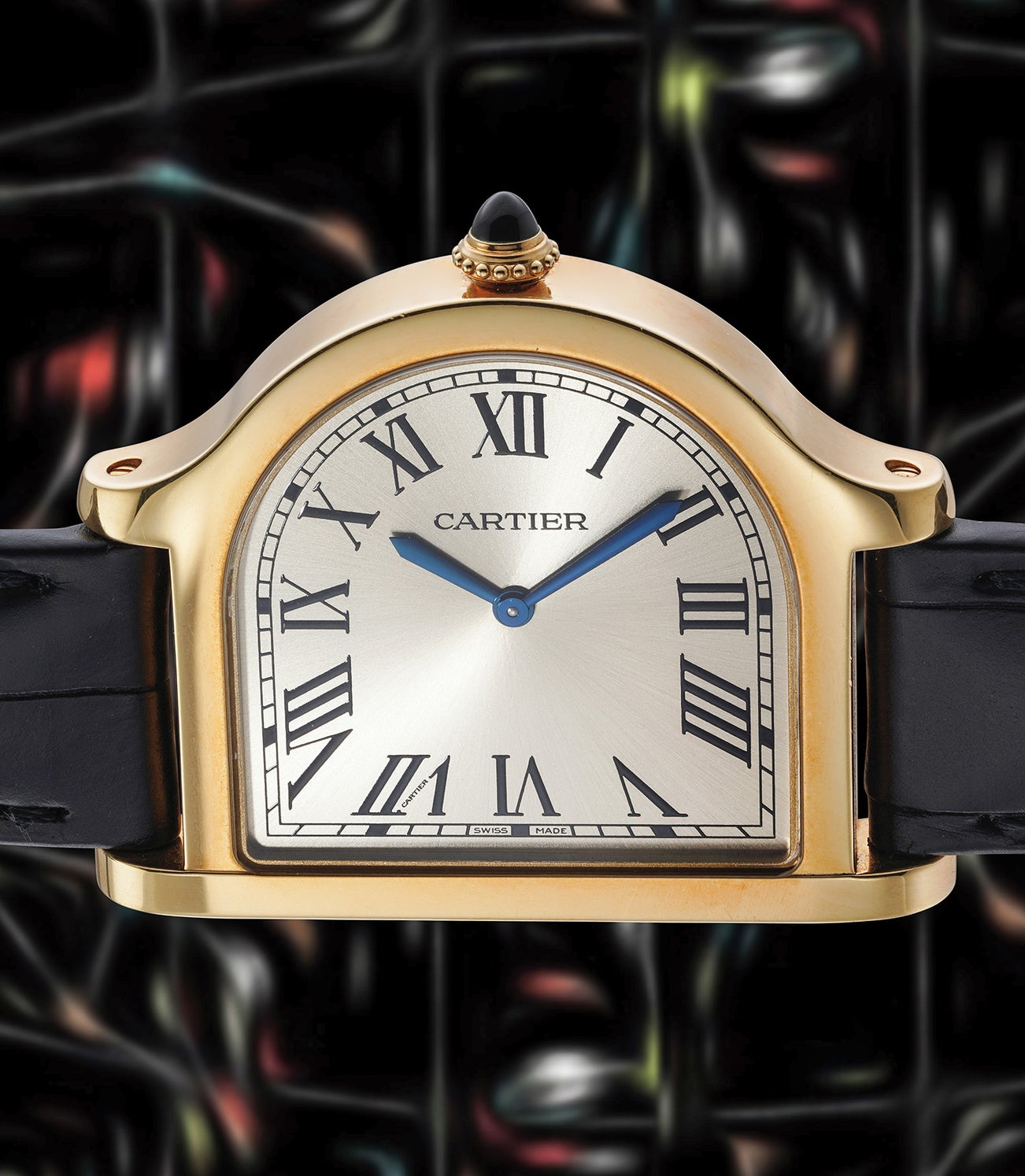 Each variation offers its own distinct dial personality: the yellow gold model, like the present example, features a golden radially brushed dial; the pink gold version showcases an anthracite grey sunburst dial; and the platinum edition offers a matte cream-colored dial. All models are adorned with blue steel sword hands and a cabochon-set crown—sapphire for the gold versions and ruby for the platinum. The inverted dial layout, with Roman numerals rotated 90° and a railway minute track on the outer rim, enhances its charm, while thoughtful details like the hidden Cartier signature within the Roman numeral seven and the fully polished case elevate its elegance. A true collector’s piece, the 2021 Cloche de Cartier seamlessly blends classic design with modern craftsmanship, celebrating the maison’s rich horological heritage in a bold and unconventional way. Accompanied by its original accessories, the present example offers a rare opportunity to own this intricate and captivating timepiece.