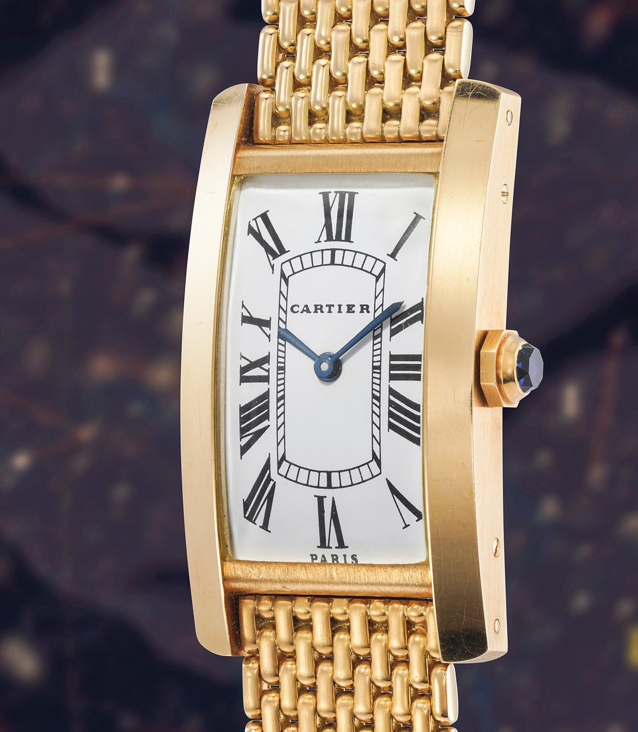 The present example, a rare mid-size iteration from circa 1980, measures 36mm in length and features a stunning yellow gold brick-link bracelet that elegantly hugs the wrist. The dial, signed "Cartier Paris," showcases a refined chemin de fer minute track and Roman numeral hour markers, exuding a "Daliesque" charm. French "double eagle" hallmarks on the caseback further confirm the piece’s origin, adding to its allure. This exceptional Tank Cintrée is a testament to Cartier’s ability to blend timeless elegance with bold innovation, making it a true collector’s treasure.