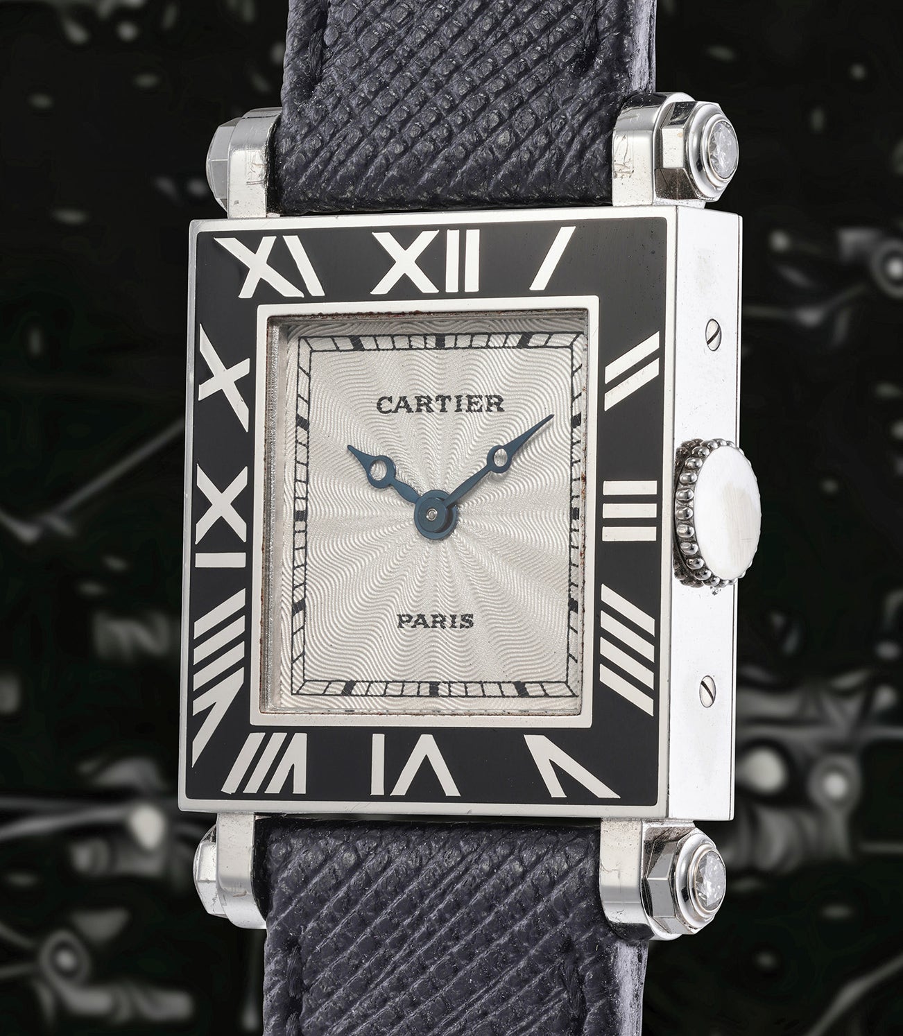 The present Rectangulaire à Pattes Vis Armurier showcases the Tank Obus' signature design with a modern twist. Crafted in white gold, it features faceted diamonds on the lug screws, a silver guilloché dial with chemin de fer and "Paris" signature, and a sleek black enamel bezel adorned with Roman numerals. Powered by a manual-wind movement, this elegant timepiece blends Cartier’s timeless sophistication with a contemporary edge. The caseback is inscribed with a "double eagle head's" hallmark, which indicates the case material to be determined as white gold; this hallmark was used in France from 1919 to 1994, further adding to its desirability. Preserved in excellent overall condition, this rare and captivating Cartier is a true collector’s piece, certain to draw admiration from enthusiasts of the Maison’s most distinctive designs.