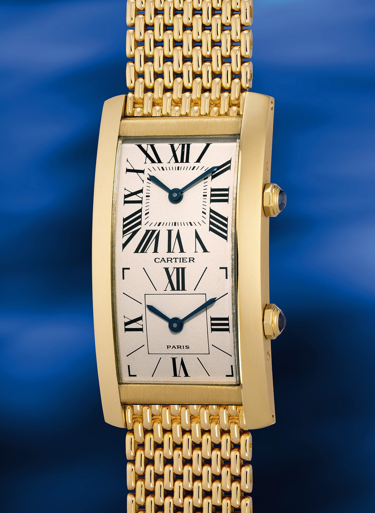 Presented in stunning condition, the present Tank Cintrée Dual-Time is cased in yellow gold and displays gorgeous Roman numerals against its ivory hued dial with vintage appeal. Sitting with two dials stacked vertically, the top dial features the classic design of Cartier’s Roman numerals for all 12 hour markers, and in contrast the second time-zone is easily differentiated at the bottom by the clean display of 12, 3, 6, and 9 only. Incredibly handsome and sophisticated with subtlety, the accompanied 13-link bracelet by Cartier underscores its supreme rarity. With majority of Cartier wristwatches born on leather strap, to find an example with the highly desirable Cartier bracelet is music to collector's ears. A true collector’s gem with a recent complete overhaul, this superb Tank Cintrée dual-time is a chance not to miss for the discerned collector of Cartier.