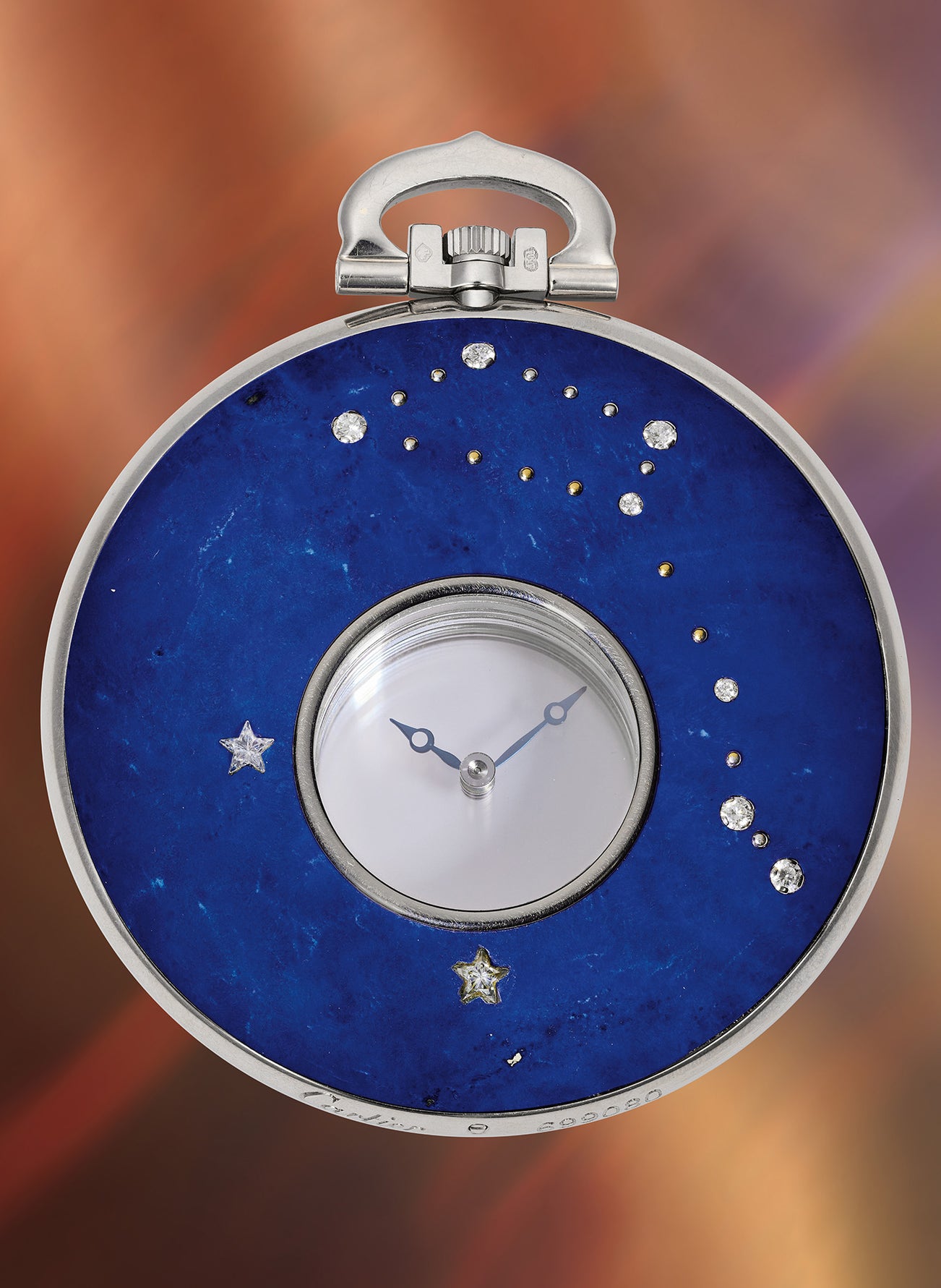 An exquisite limited edition white gold mystery pocket watch with diamond-set lapis lazuli plaques