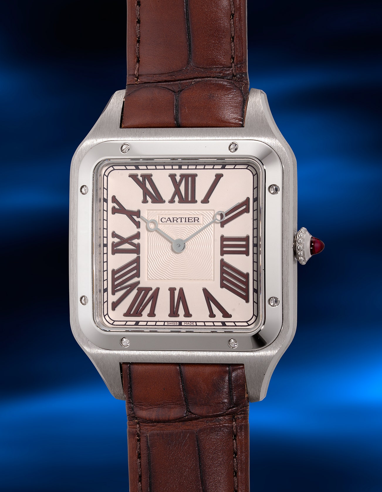 - Each of these models features exquisite guilloche dials adorned with hardstone Roman numerals, a hallmark of Cartier's craftsmanship. The current platinum example is particularly noteworthy, showcasing red jasper Roman numerals—a rare choice for watch dials. These eye-catching models are designed for comfort on the wrist and are limited to just 200 pieces. Additionally, they exhibit a sunray and textured guilloche effect on the dial, paying subtle homage to the coveted CPCP collections.