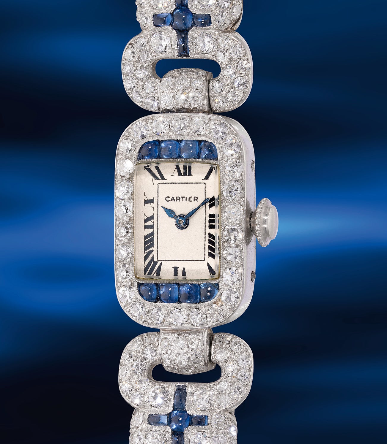 A lady’s magnificent and exceptional platinum, diamond, sapphire and black enamel-set bracelet watch with European Watch and Clock movement