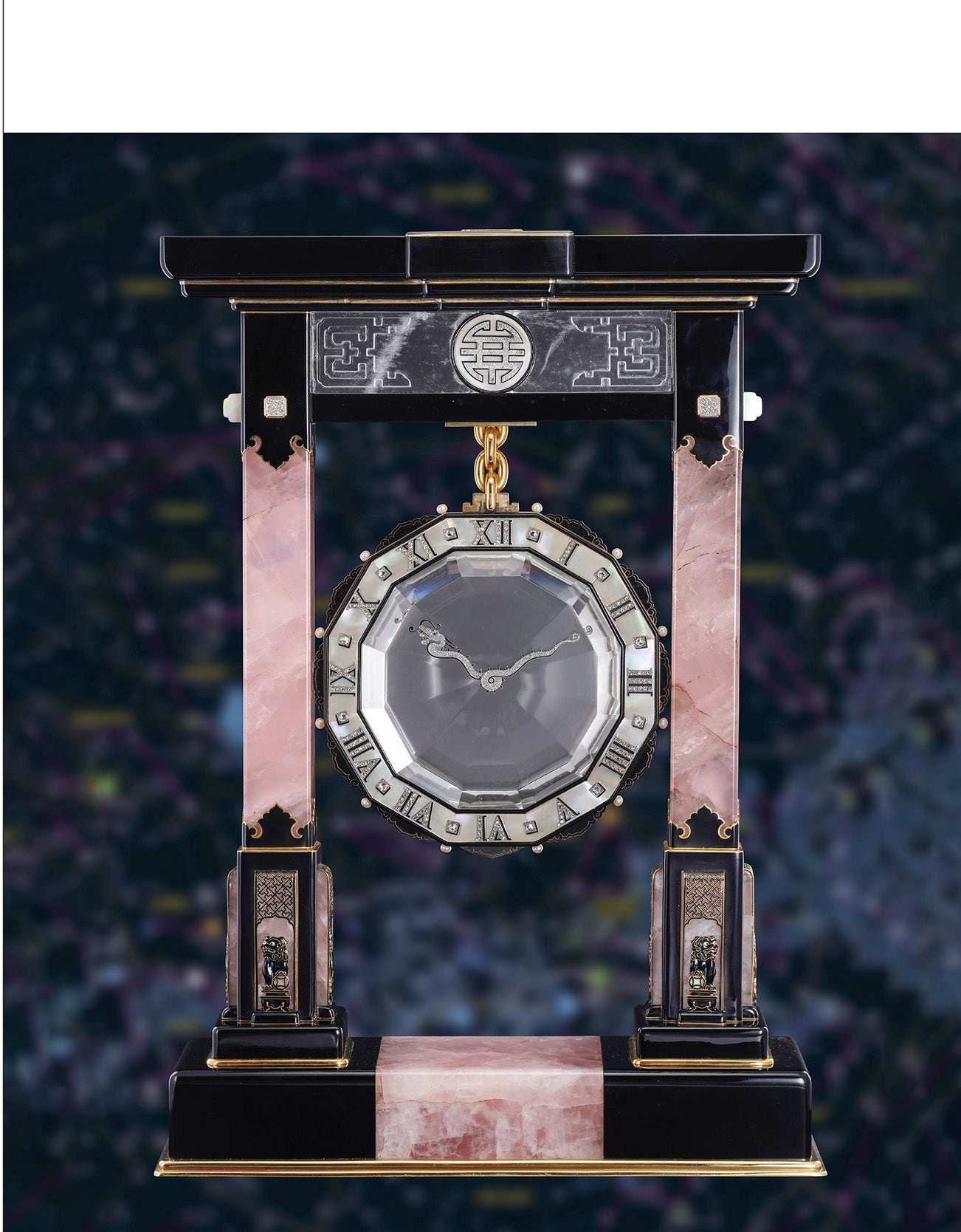 A historically important, unique and museum quality rose quartz, enamel, onyx, rock crystal and diamond-set Portico Mystery Clock with rock crystal dial and diamond-set mother-of-pearl inlay bezel