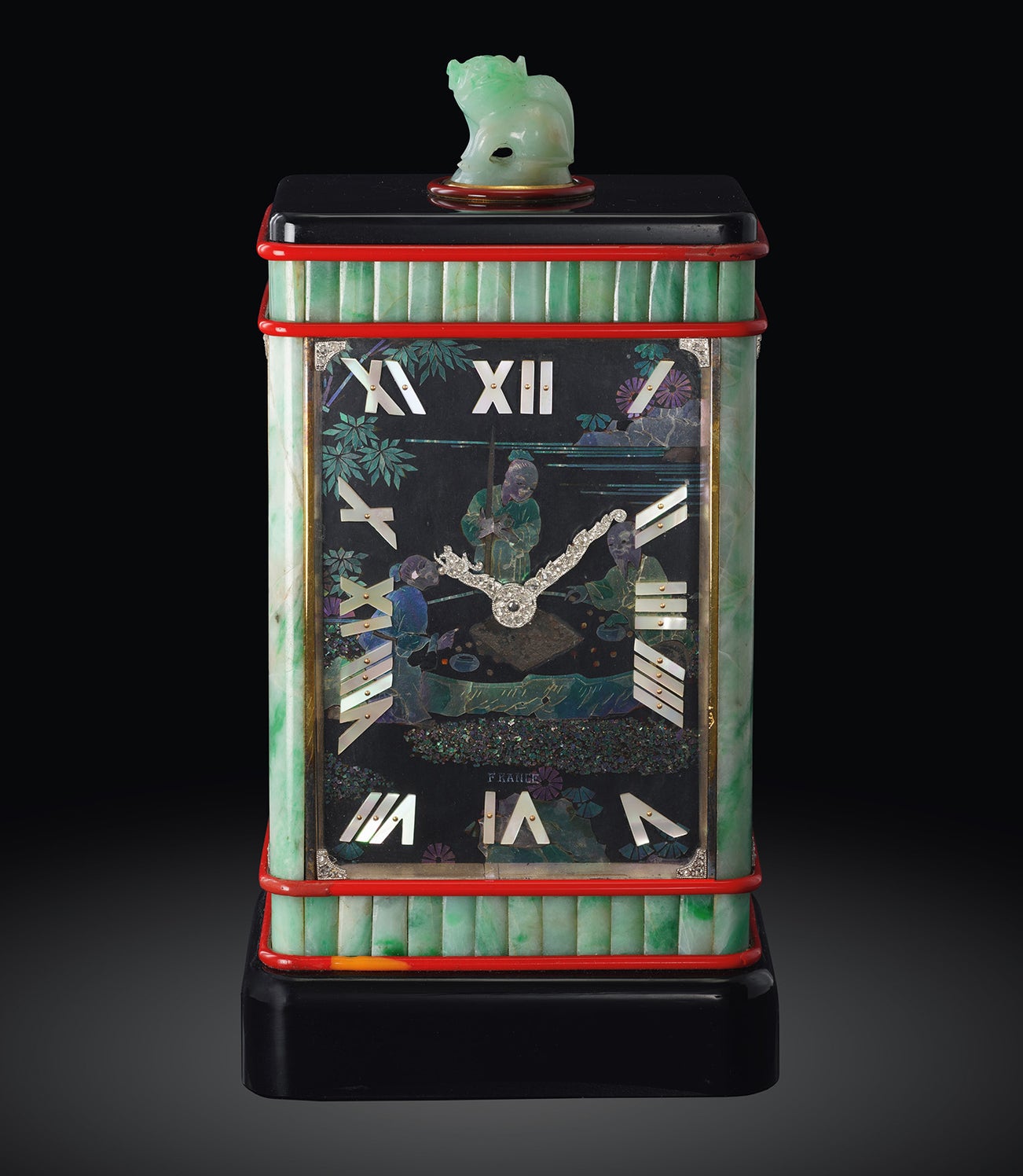 The present clock also known as the Pendulette à Répétition a Minutes is from 1929 and is inspired by the Far East. It is fitted with striking nephrite panels throughout the edge of the case and sides – an obvious nod to the Asian influence on design – designed to look like bamboo marshes enclosing the scene on each panel. A nephrite “Fu Dog”, representing protection, sits on top of the clock and activates the minute repeater. To date, we only know of a few timepieces in this design and style, with each piece depicting a unique scene, with one example in the permanent Cartier Collection.