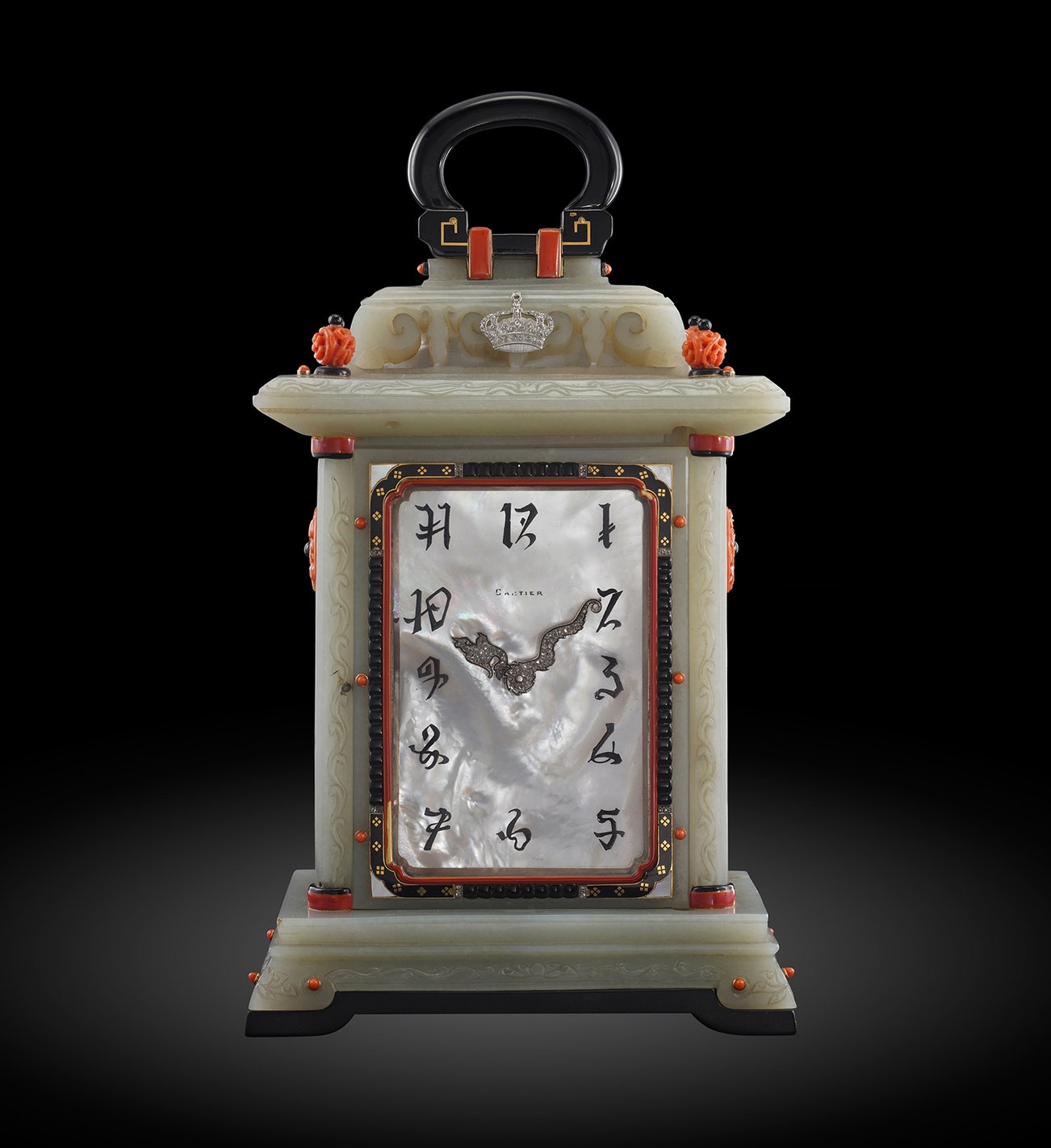 An exceptional, unique and museum-quality nephrite, yellow gold, onyx, lacquer, diamond and coral-set illuminated desk clock styled as a lantern with double mother-of-pearl dials and presentation box