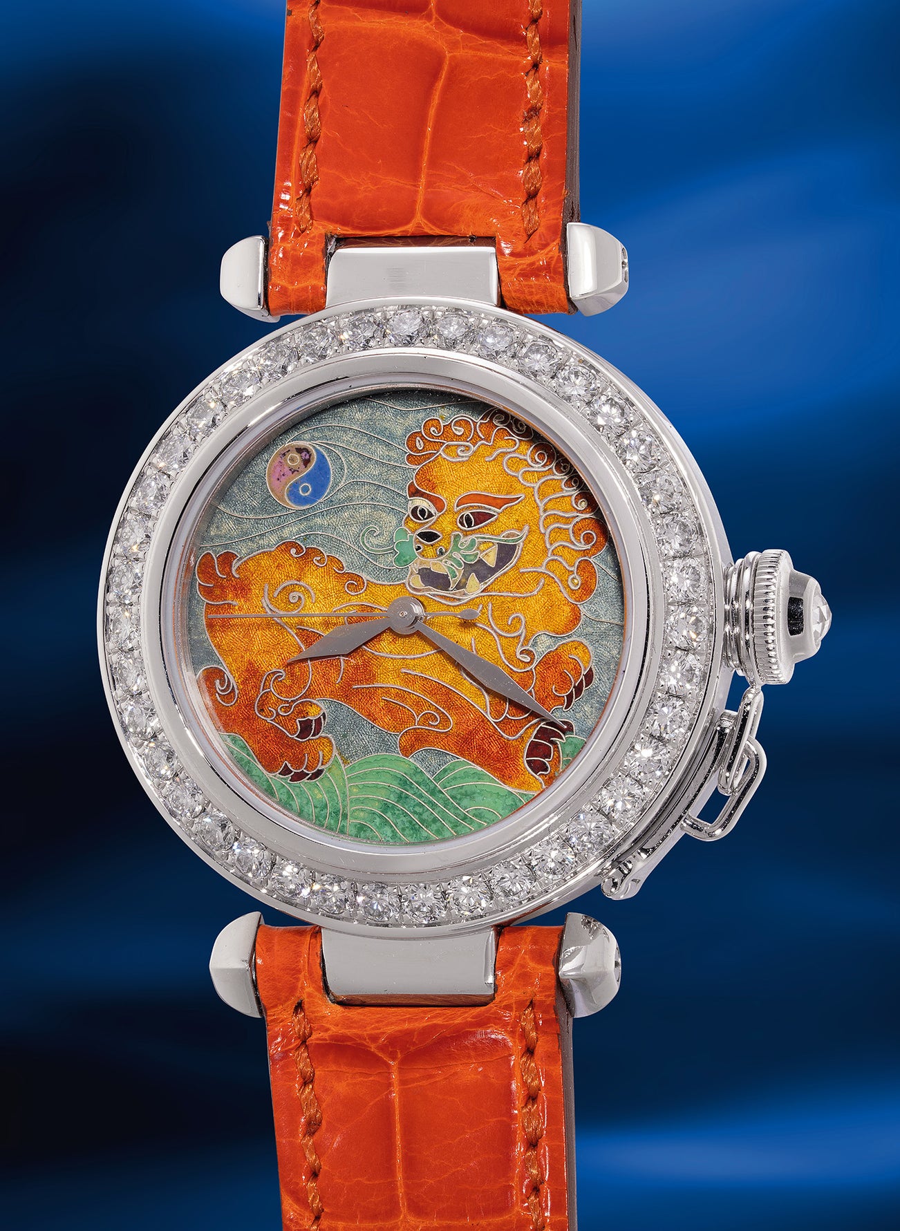 The present Cartier Pasha represents one of the most playful iterations of the model from the 2000s. Created as part of a cloisonné enamel limited series in white gold, it showcases a vibrant and whimsical depiction of the Chinese Imperial Guardian Lion, featuring a strong and muscular presence. These lions, traditionally found in Imperial Chinese palaces, were believed to protect buildings from harmful spiritual influences and threats.