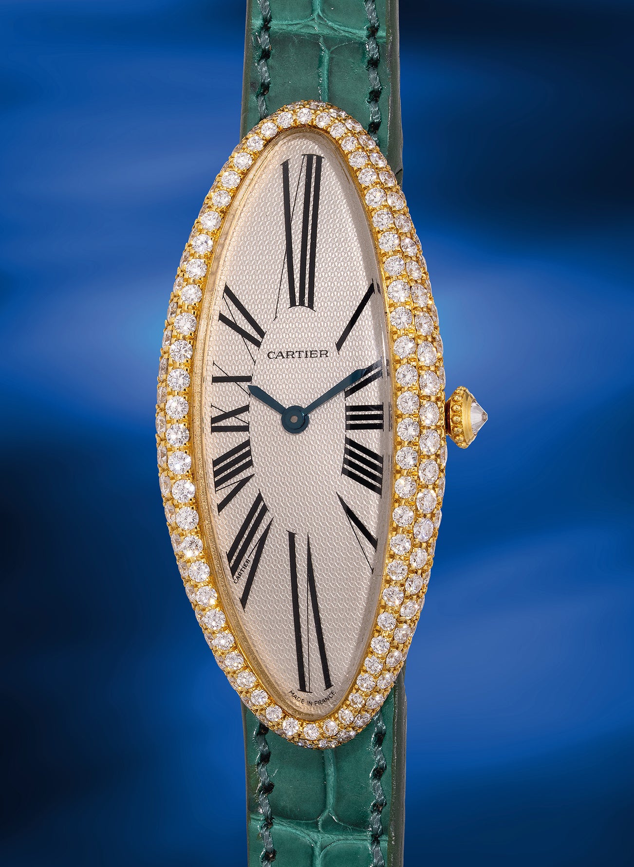 Faithful to its original design, the present yellow gold variant of the Baignore Allongée from circa 2000s is dressed in glamour and elegance of Parisian chic. Adorned with diamonds in contrast with the ivory hued guilloché dial, the sword hands are finished in blued steel which adds a nice touch of colour to its lavish appeal. Although it measures with a dramatic 47mm by 21mm case, its curved shape wraps around the wrist with incredible comfort. Featuring the classic Roman numerals and secret signature at 7 o’clock and preserved in stunning condition, the present example is a timepiece of elegance and class.