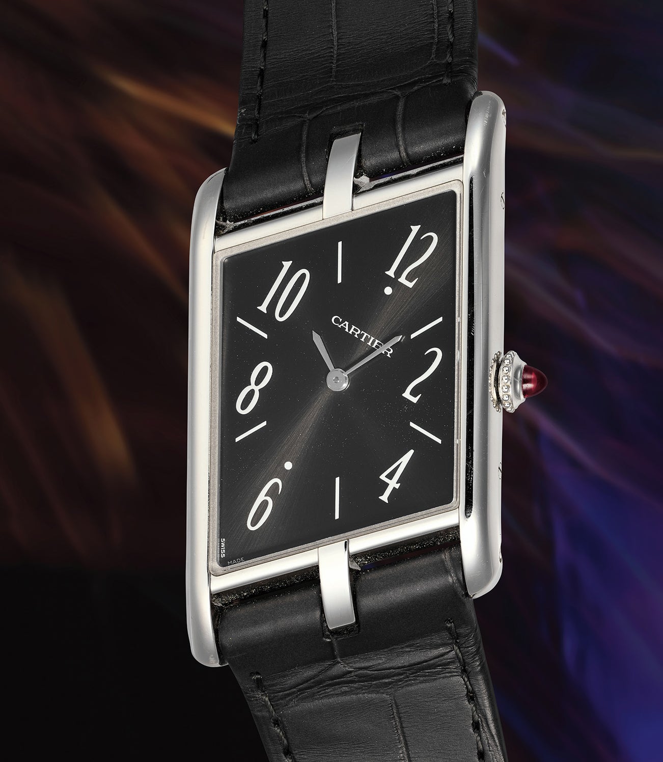 The present, very likely unique example, commissioned through Cartier’s now-paused New Special Order (NSO) program, is a singular expression of the model’s enduring allure. Housed in a platinum case and distinguished by a rich anthracite sunburst dial with crisp white stylized Arabic numerals, it is a piece that fuses historic design with contemporary refinement. The presence of a ruby cabochon—a signature marker of Cartier’s platinum timepieces—adds a final flourish of opulence.