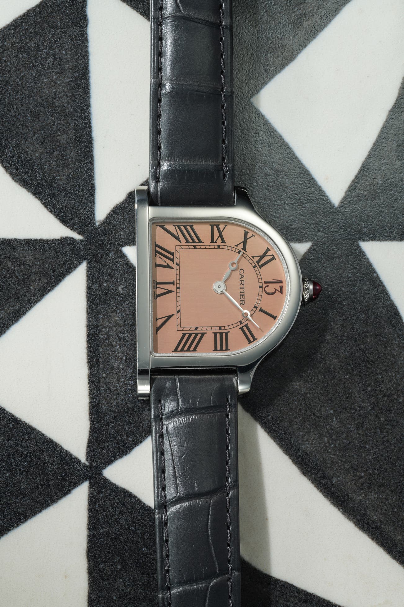 An extremely rare platinum bell-shaped wristwatch with salmon dial, warranty and presentation box made for Cartier's 13 Rue de la Paix boutique in Paris