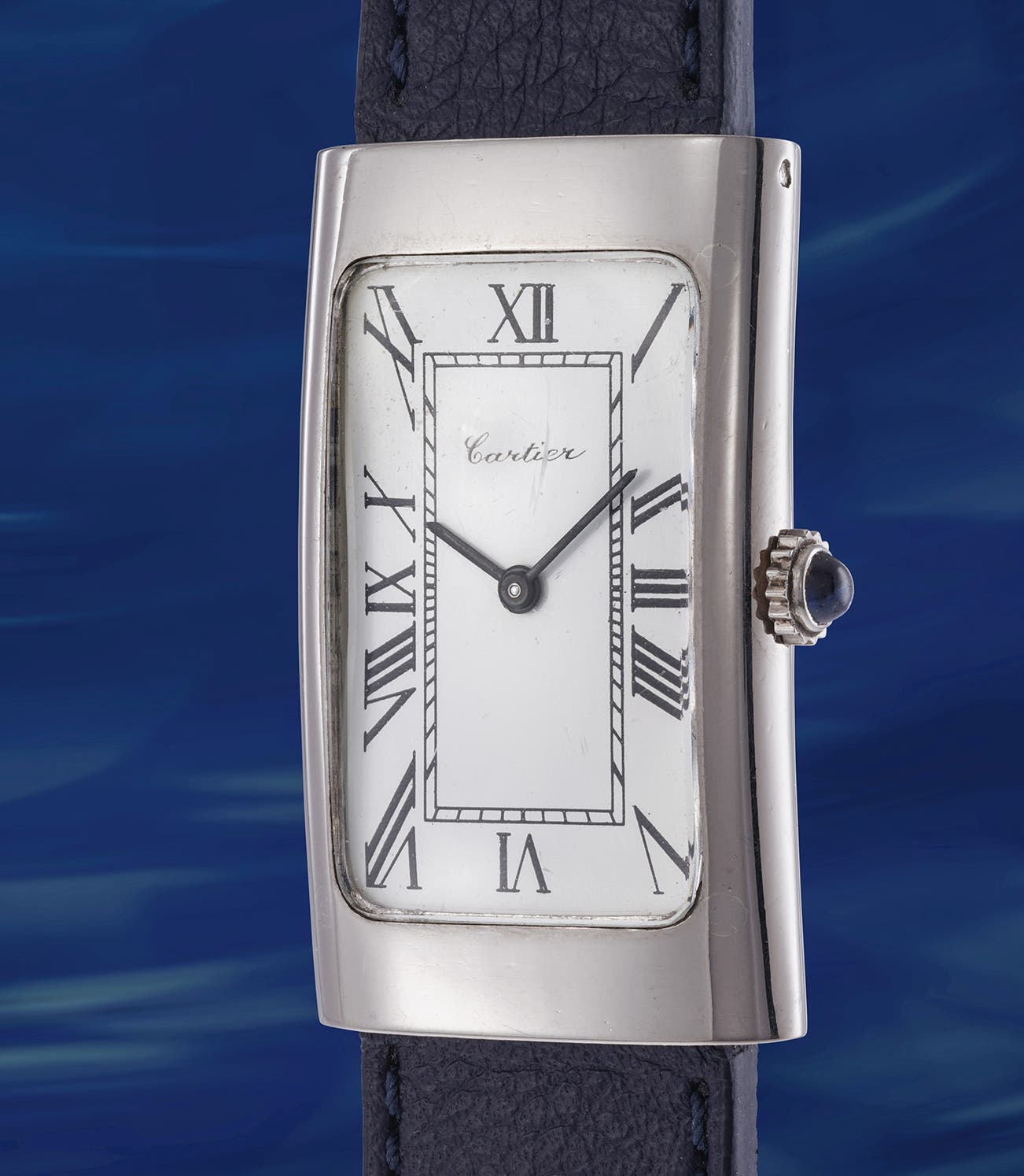 The present example, however, is no ordinary model, but a rarely found Rectangulaire. Produced in the 1970s, it features a rare rounded case without lugs, most likely retailed by Cartier Paris, as confirmed by the crisp eagle head hallmark on the case. Its extra-slim profile and integrated leather strap ensure it sits beautifully on the wrist, while the dial is distinguished by an unusual Cartier signature font. Even rarer is the Vacheron Constantin movement, showing how Cartier had outsourced their movements in the past. The present watch is prominently displayed in Cartier White Bianco by Osvaldo Patrizzi, page 189, Antiquorum Editions.