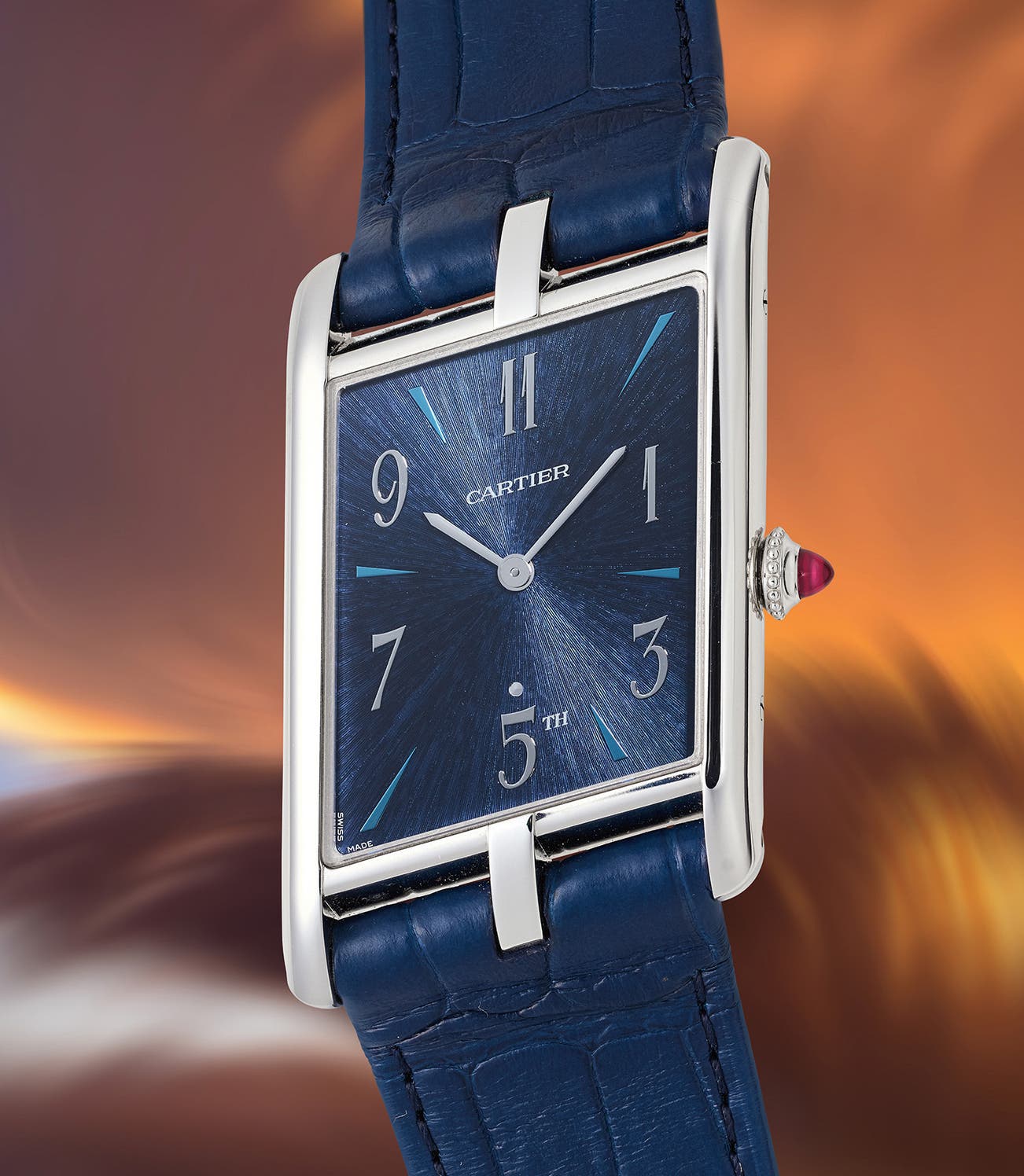 Exclusively available at the Cartier Fifth Avenue Mansion in New York, the present lot was released in a limited production, reserved for the boutique's best clients. Housed in the noblest metal, platinum, the watch showcases a blue dial with a radial texture, reminiscent of fireworks against the night sky. Paying tribute to the Fifth Avenue Mansion, the watch features a uniquely designed dial that displays only the odd numbers in Arabic numerals, with the 5 o'clock position marked as "5th," symbolizing Fifth Avenue. The even numbers on the dial are rendered in a lighter shade of blue, creating a perfect harmony that complements the overall design. The back of the watch features a unique laser-engraved emblem dedicated to the New York Mansion.