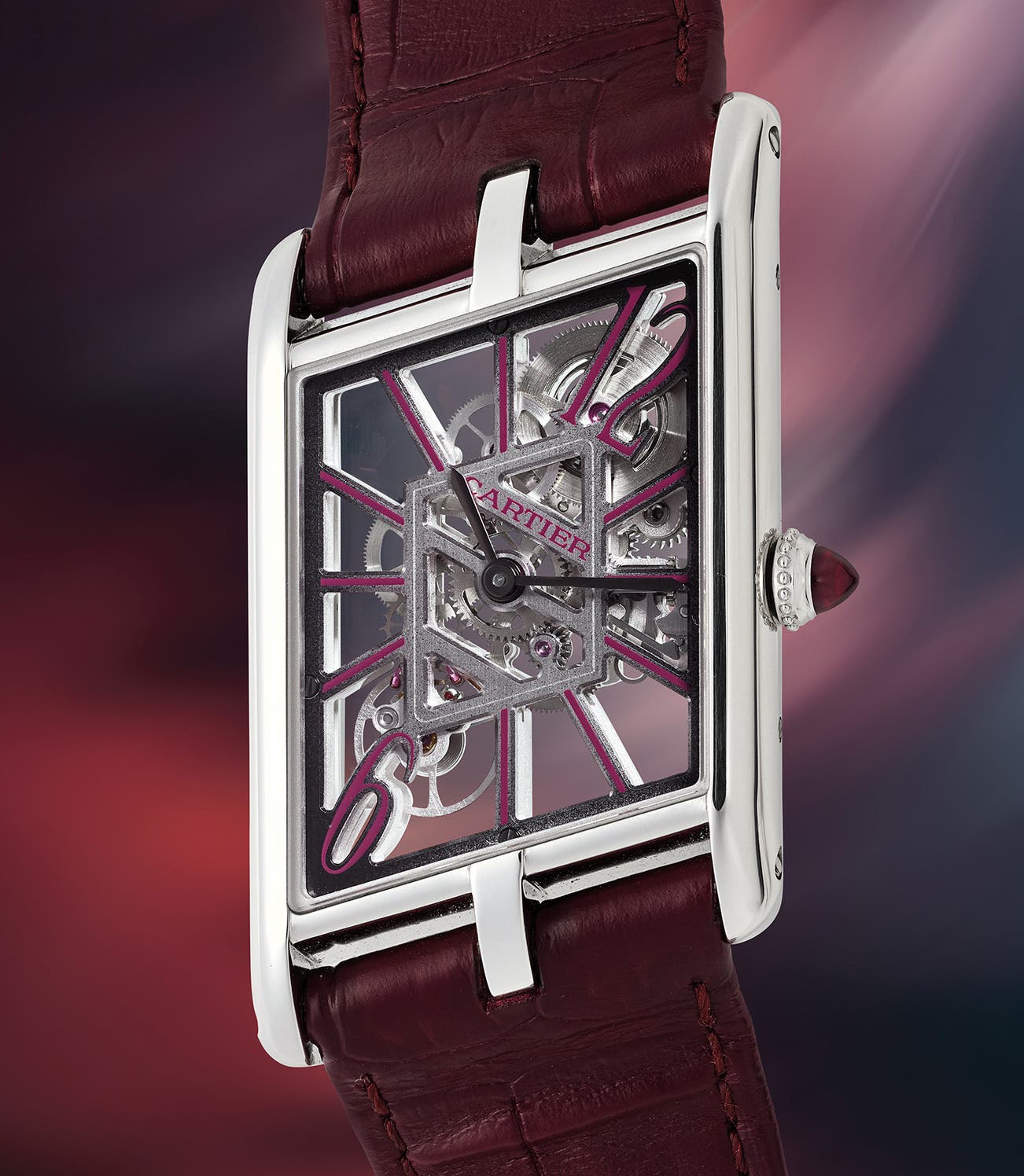 Part of the so-called “Temple Exclusive”, the present Tank Asymétrique with burgundy lacquer-filled skeletonized indexes and numerals, has rarely been seen publicly. Only 60 pieces were made and these examples were only available at the London, Paris, and New York City boutiques as part of their off-catalogue offering. The complementary burgundy strap and ruby cabochon further enhance the cohesiveness of the watch. It is presented in excellent overall condition, with all its original accessories, and offered on behalf of an important international collector.