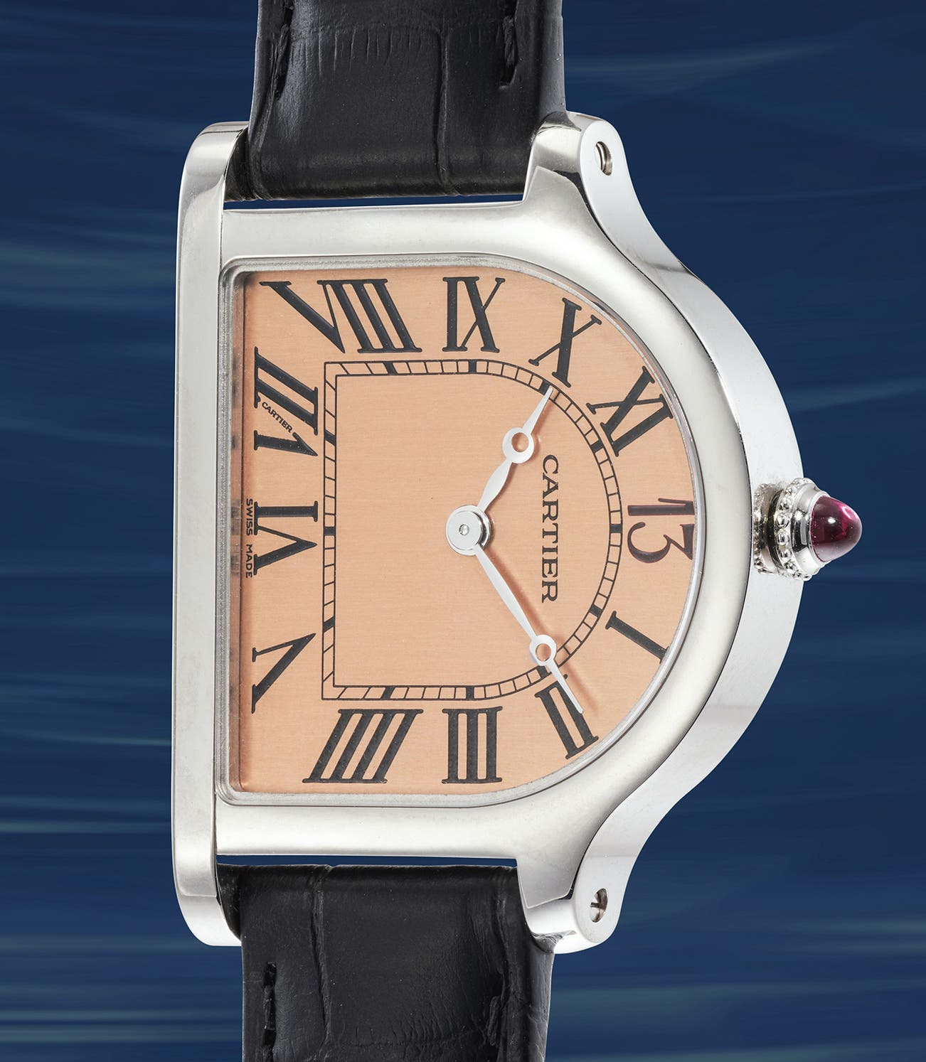 The Cloche de Cartier is, undeniably, an odd one. If the name does not ring a bell, have a look again. Straight forward enough, the word “cloche” translates to “bell” and evidently, this model’s name is derived from the fact that the watch resembles one resting on its side. Exuding an exotic charm, the Roman numerals on the dial are adjusted 90° clockwise from their habitual stance, with the 12 o’clock index sitting where 3 o’clock usually does, next to the crown. If one is accustomed to telling time off traditional analogue wristwatches, this may require some time to adapt to. In the present example the Roman numeral XII is replaced by an Arabic numeral 13, a nod to Cartier's Paris boutique address (13 Rue de la Paix).