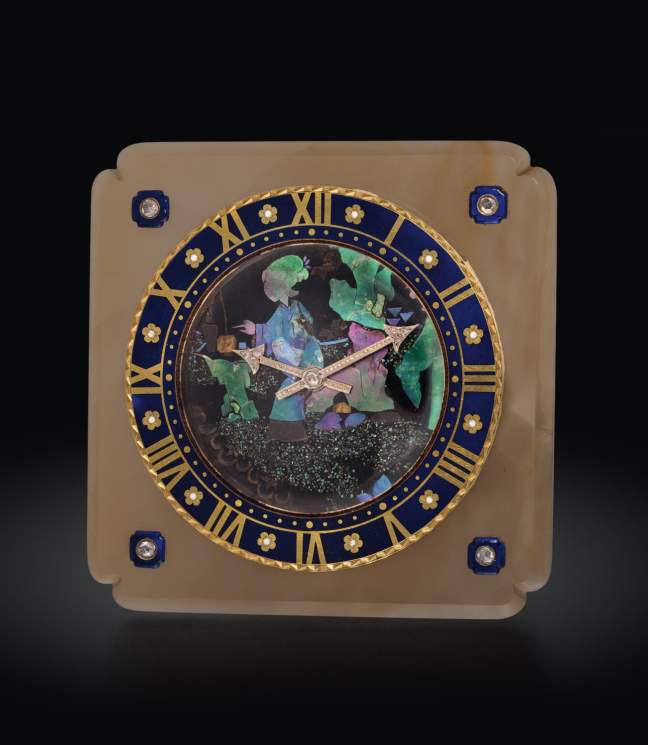 A unique and attractive desk clock with strut, “Laque Burgauté” panel, agate, mother-of-pearl, gold, enamel, sapphire cabochons and diamonds