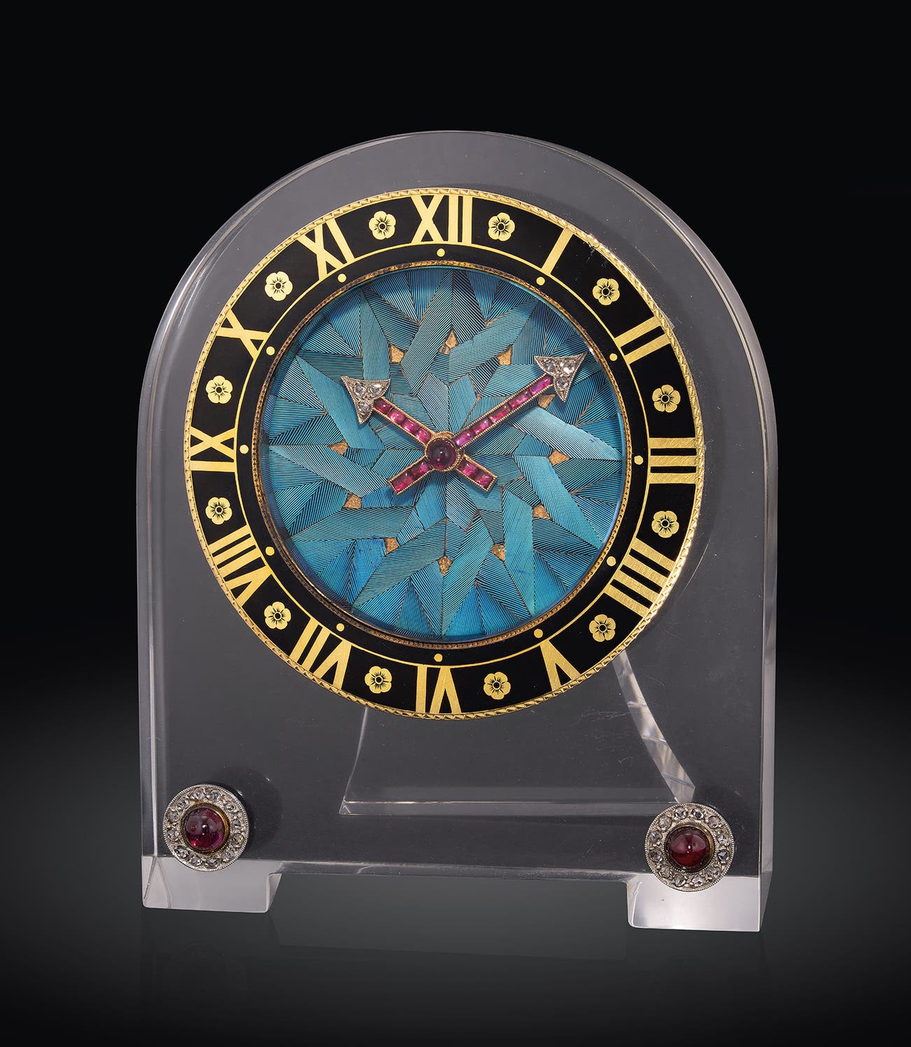 This desk clock with a rock crystal surround and strut from circa 1925 exemplifies the masterful creations of Coüet. Extremely elegant, the present desk clock topped it off with a rare craft to this already stunning piece. Tian-Tsui, is a Chinese craft featuring kingfisher feathers. For 2,000 years, the Chinese have been using the iridescent quality of these blue feathers of the majestic bird as inlay for fine art objects, panels and screens. Its unique electric blue sheen from the bird achieves a vivid colour that no enamel can replicate. An extremely painstaking artisanal technique that demands the most skilled craftsmen, back in the days Cartier was able to deliver this rare trade in their Parisian workshop. Within a circular dial the artist cleverly uses the linear qualities of the kingfisher feather to create a radiating star-shaped motif with gold filling. The diamond-set arrow hands are further heighten with rubies for legibility. The delicate black enamel chapter ring decorated with gold Roman numeral markers and floral motif (appearing often on Cartier timepieces throughout the 1920s). The rock crystal arched frame is anchored with two cabochon ruby and rose-cut diamond decorations to complement the hands.